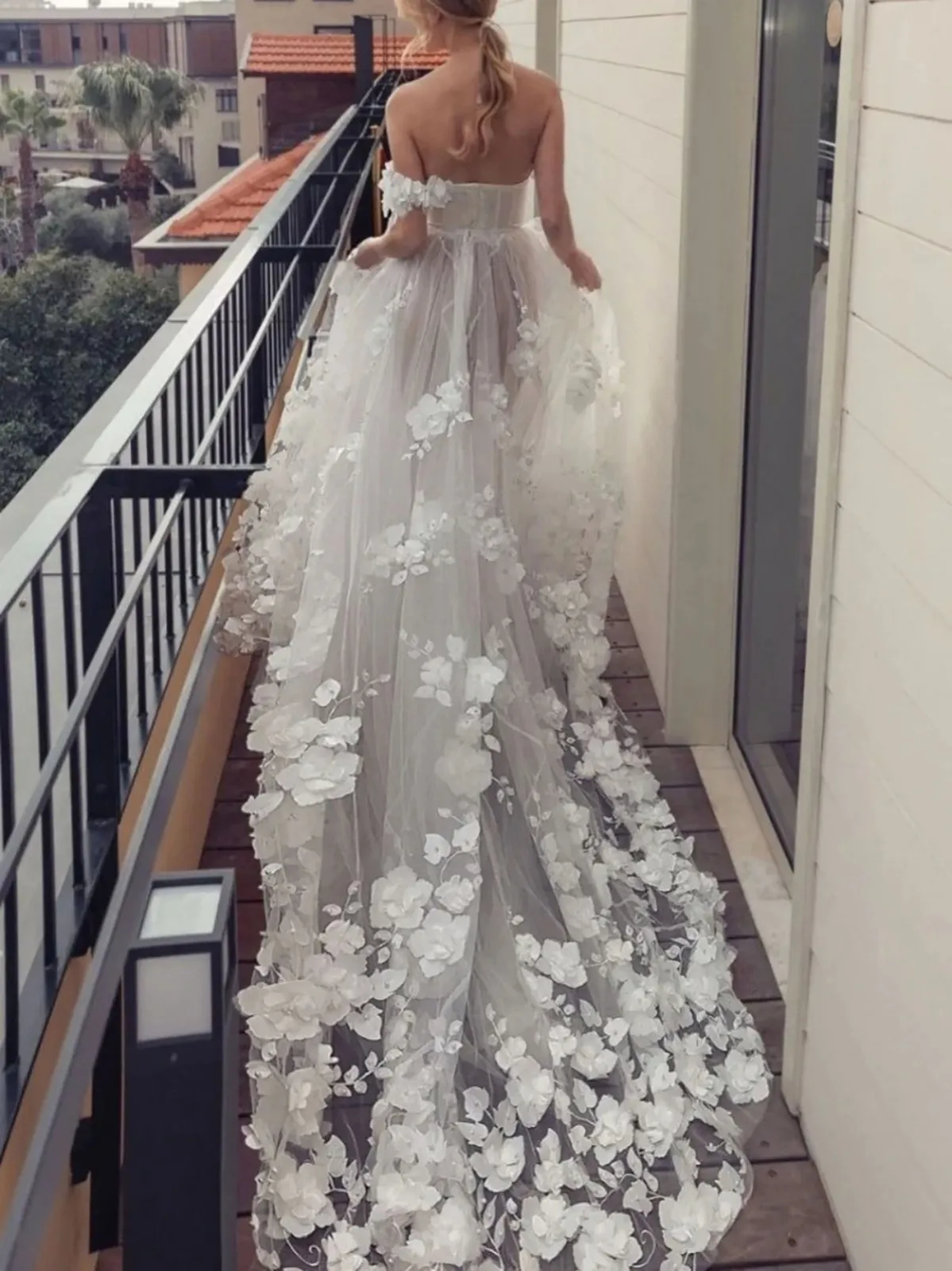 Elegant A-Line Wedding Dresses Off Shoulder Sweep Train 3D Floral Bridal Gowns