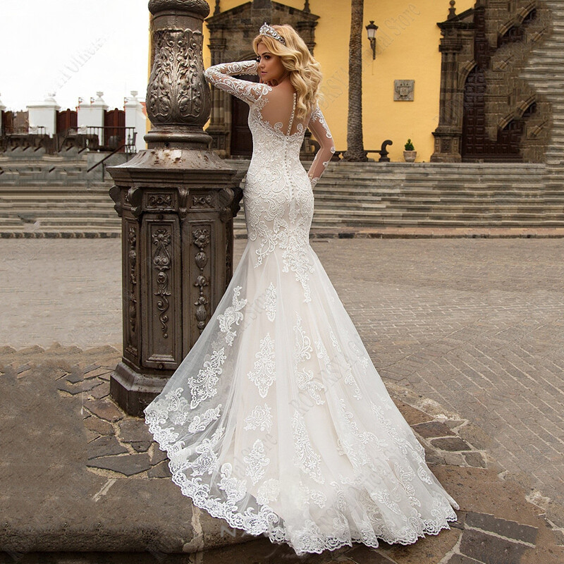 как выглядит Elegant Mermaid Wedding Dresses Lace Applique Long Sleeves Bridal Gowns TrainHot фото