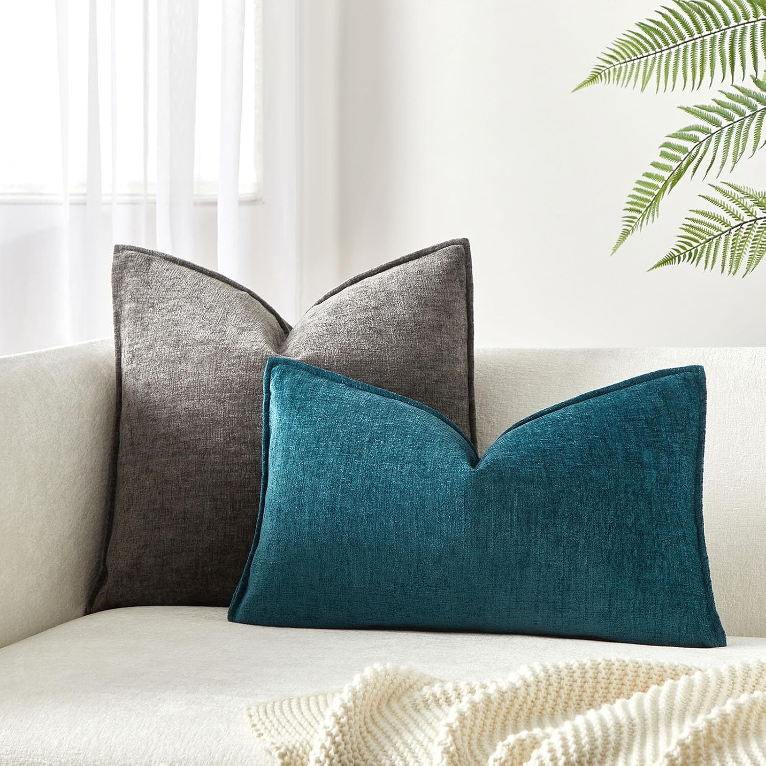 Set of 2 Light Green Chenille Lumbar Throw Pillow Covers 12x20 Inch Soft Text...
