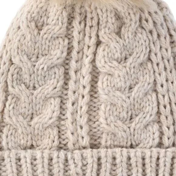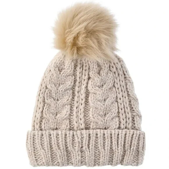 Pom Cable Knit Insulated Beige One Size Hat NEW