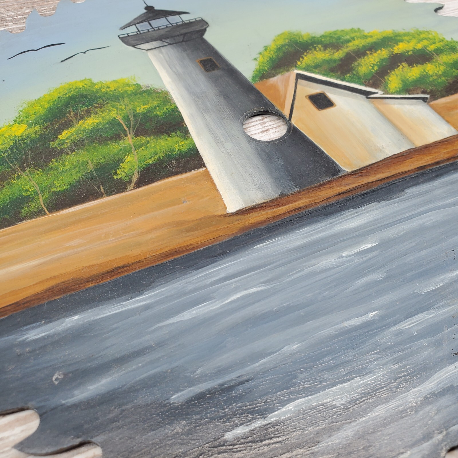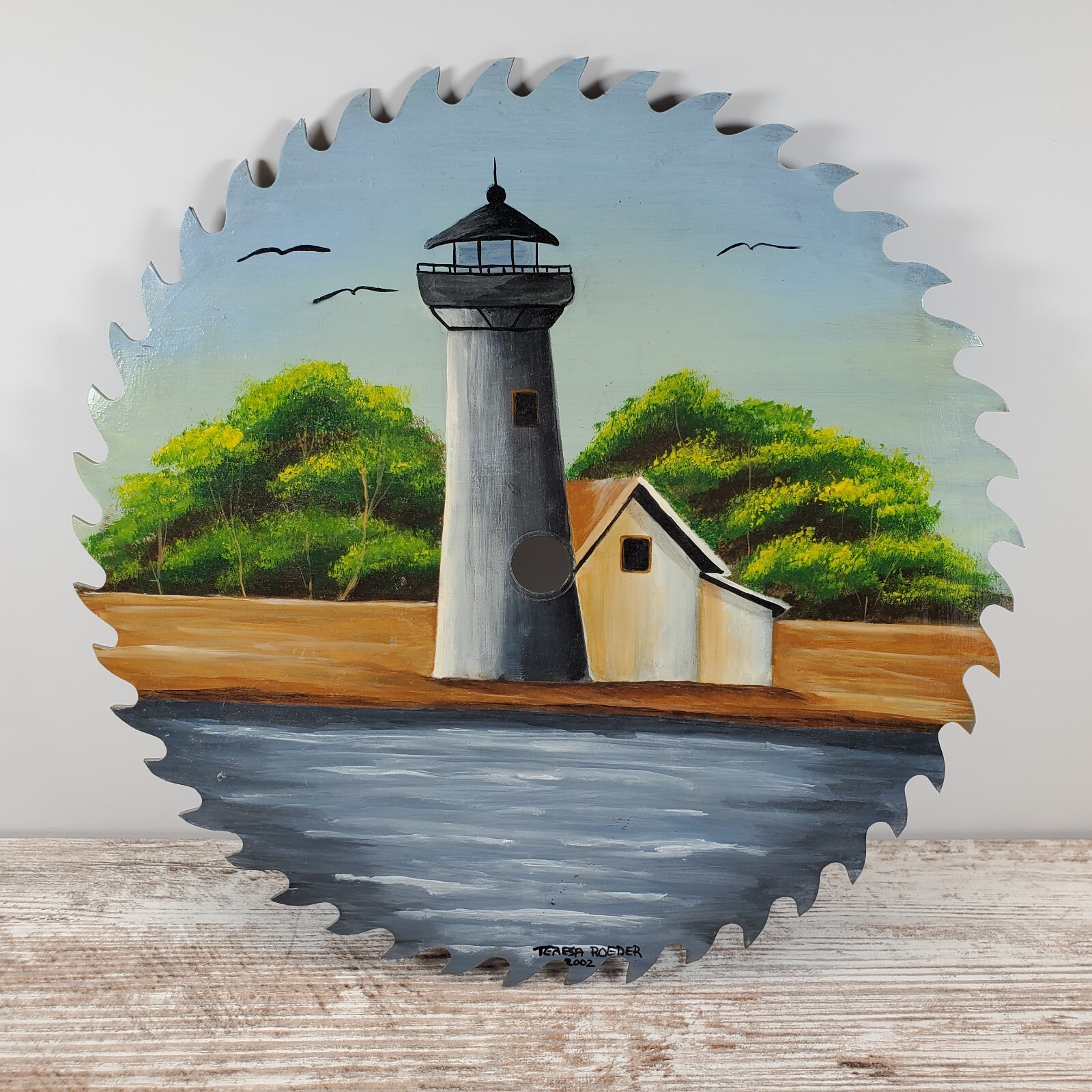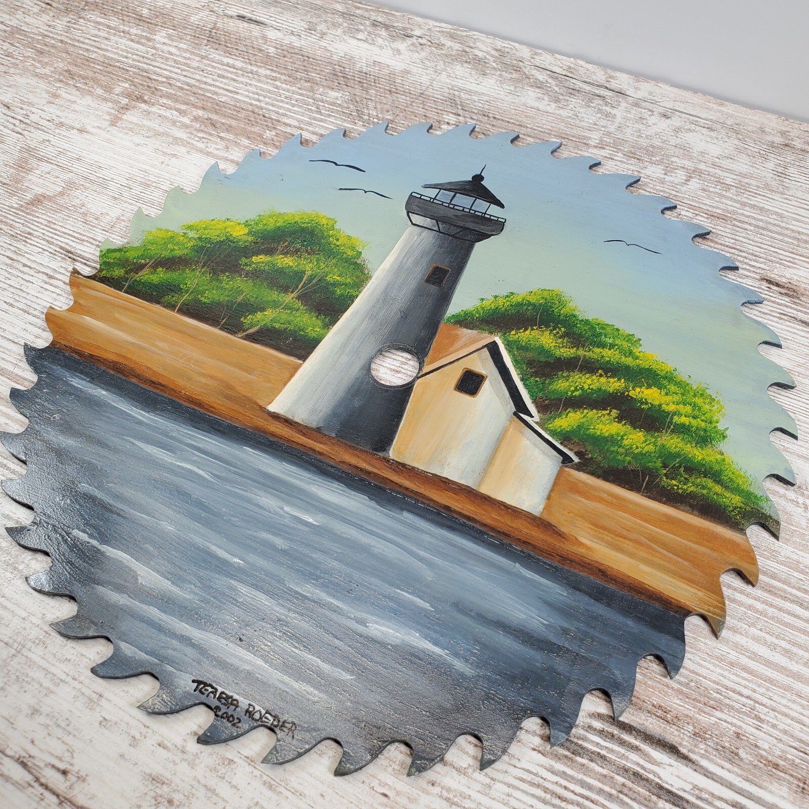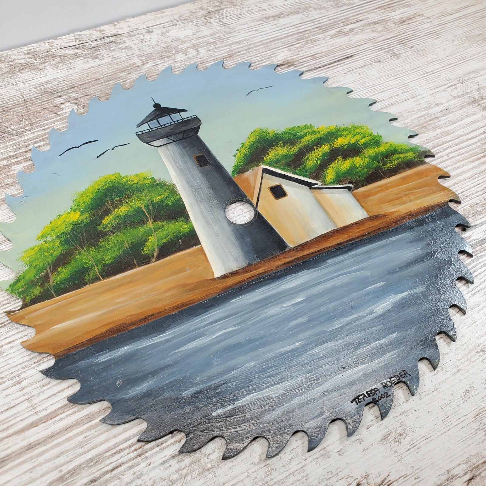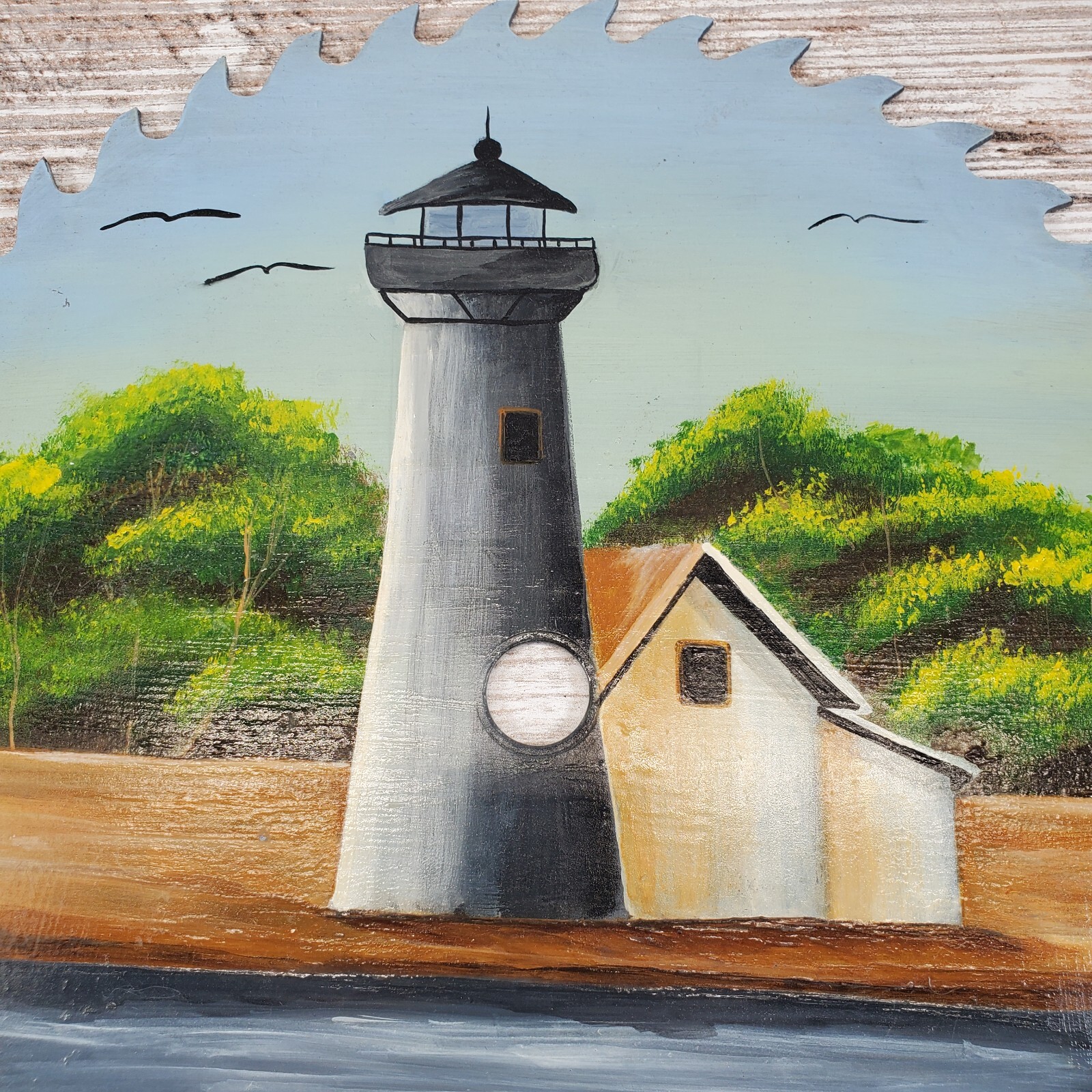 Hand Painted Circular Saw Blade Lighthouse Water Scene Nautical Wall Art Decor