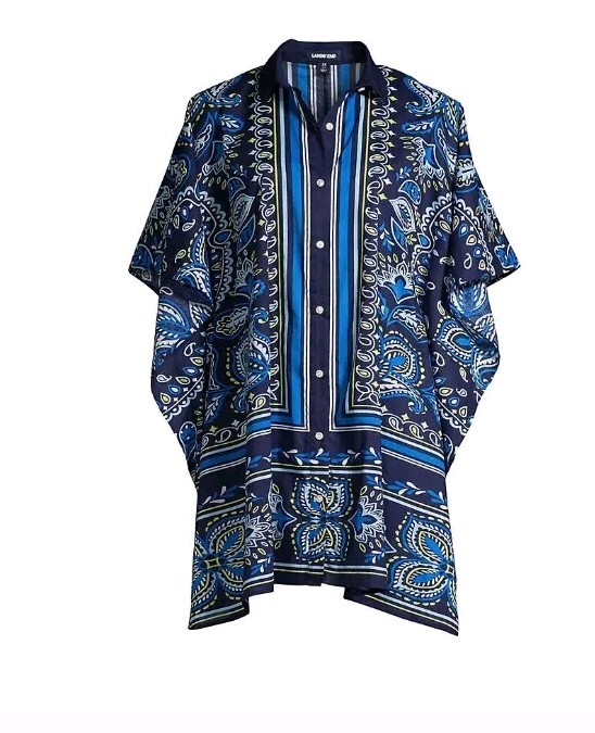Lands End Cover Up Xs 2-4 Blue Kaftan Tunic Cotton Poplin Button Down Paisley