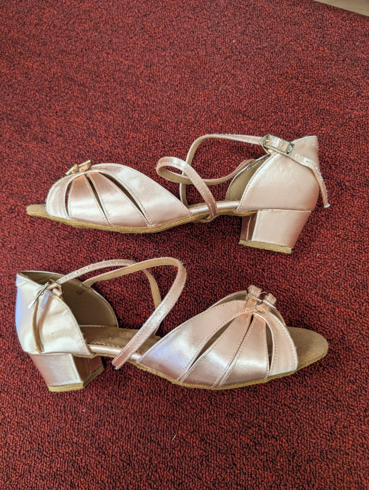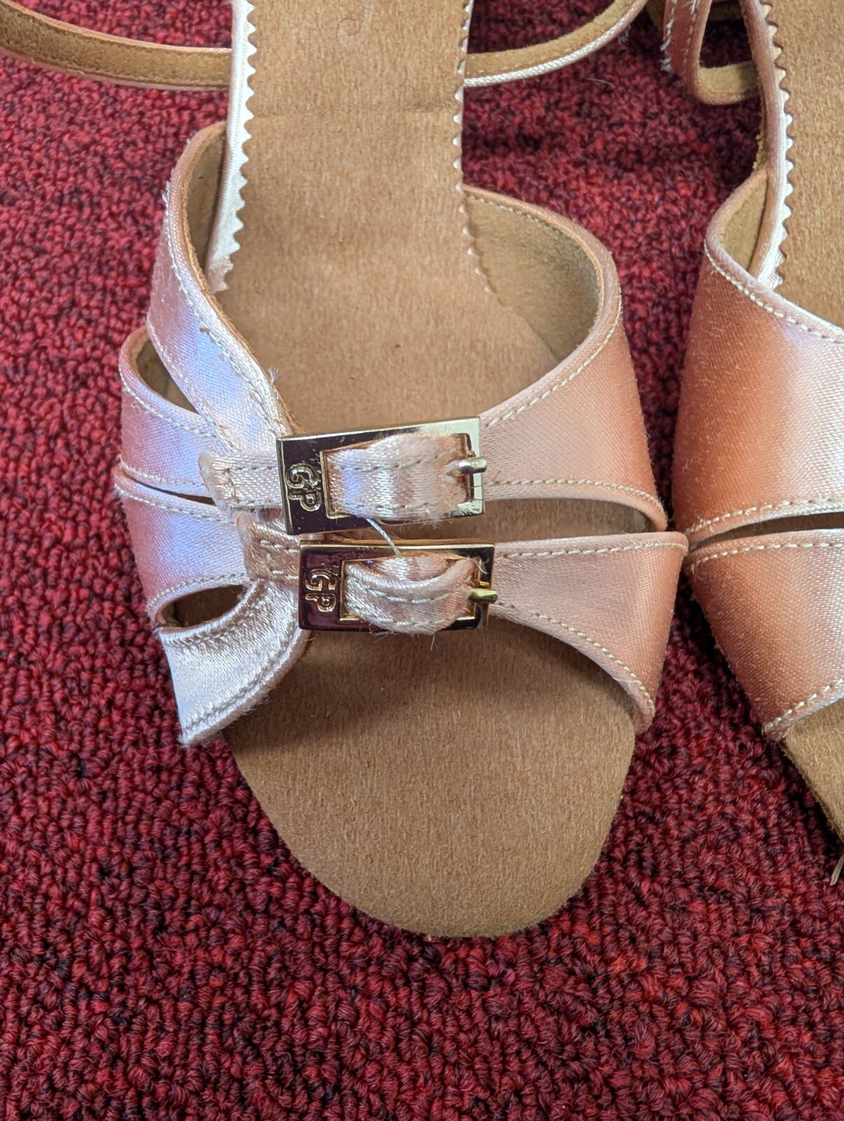 как выглядит Grand Prix Jive Ballroom Shoes Tan Satin Suede Bottoms Low Heel New With Box фото