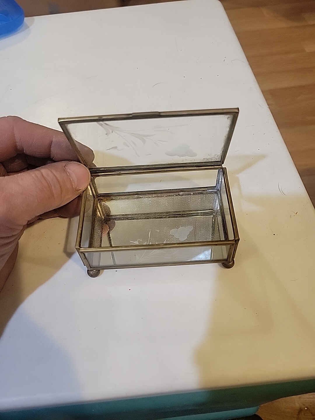 • Vintage Brass Glass Display Trinket Jewelry Box Floral Etched Mirrored Footed E