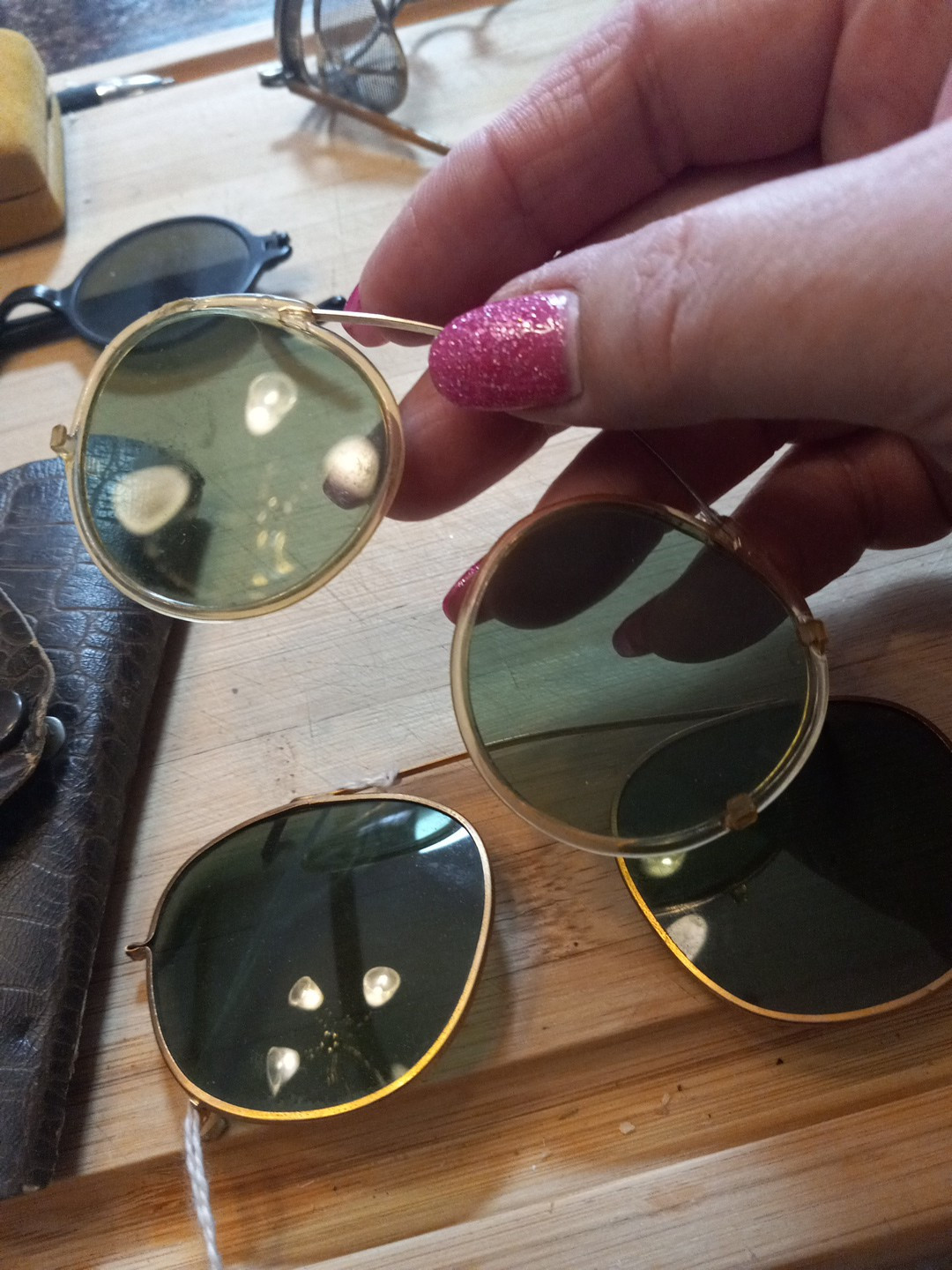 как выглядит 2 Vintage Clip On Sun Glasses Smoke Lens Gold Frame 1950