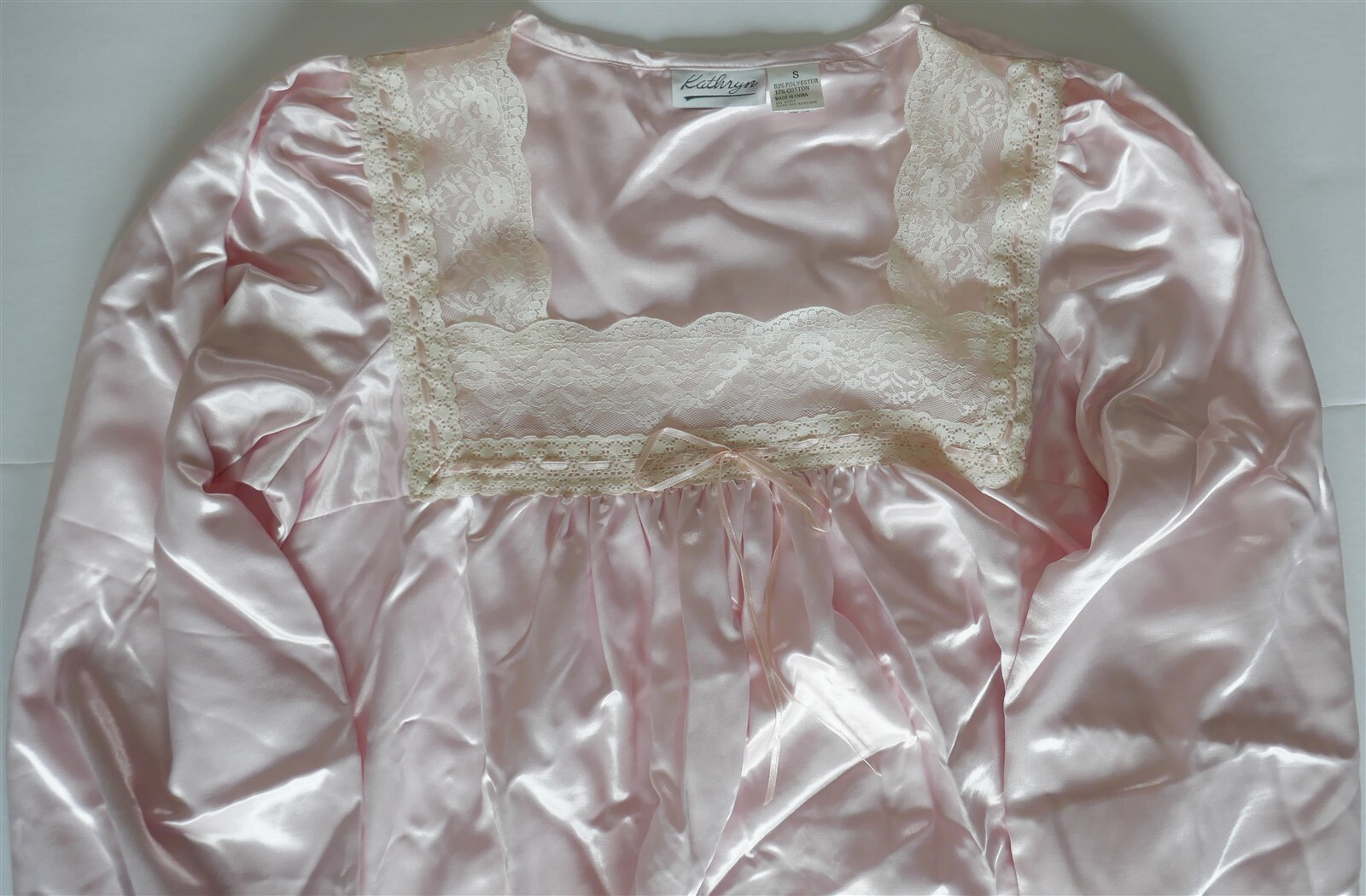 VTG NWT Kathryn Pink Satin LS Long Nightgown Women S Poly/Cotton LACE Ruffle
