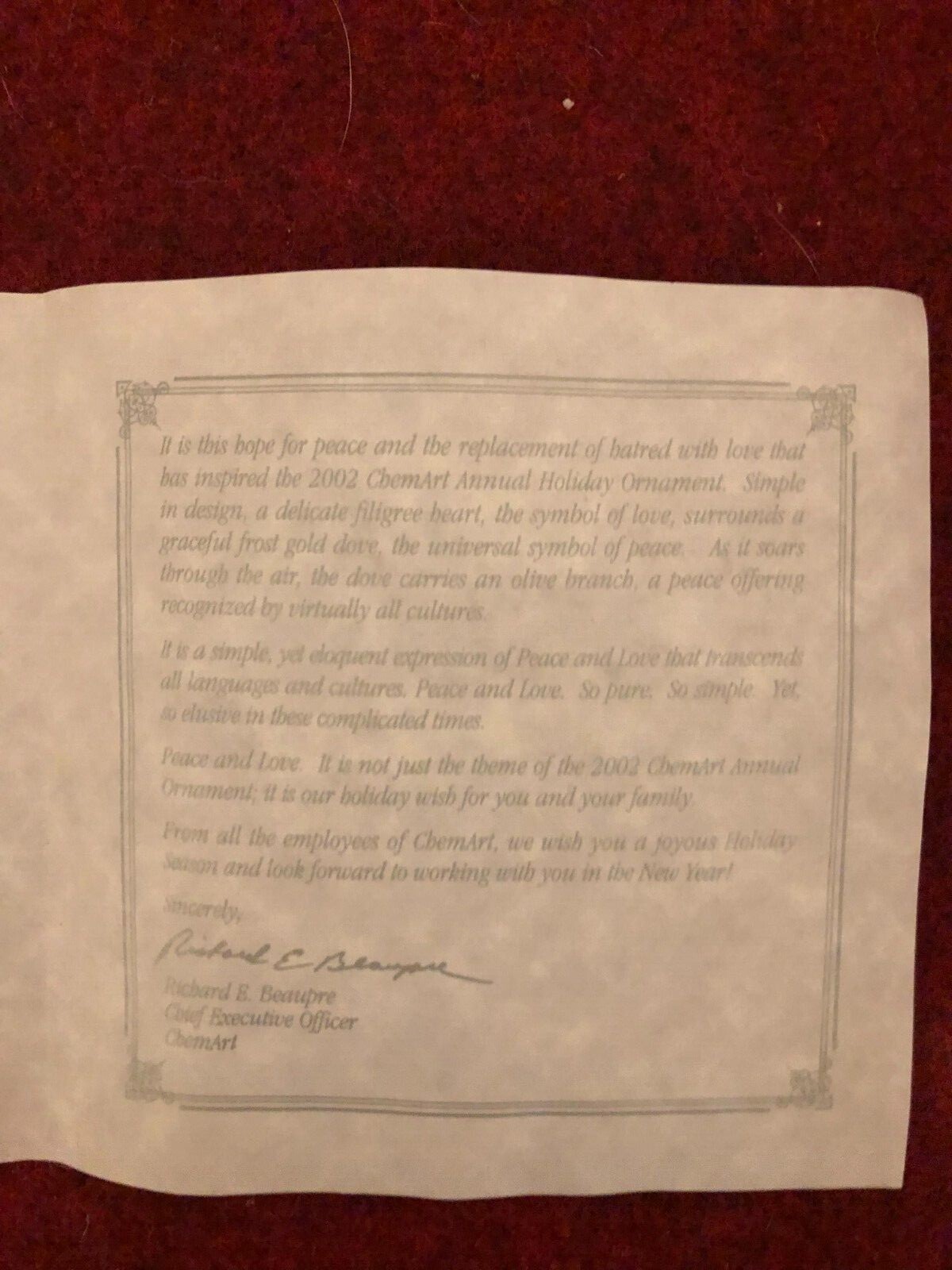 2002 ChemArt Christmas Ornament-Peace Love-in box paper