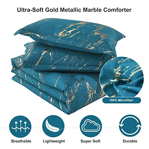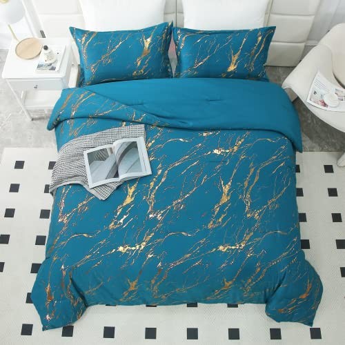 Teal Gold Metallic Marble Comforter Set King Foil Print Glitter Bedding Sets
