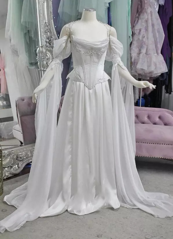 как выглядит Vintage Medieval Wedding Dresses Off Shoulder Flared Sleeves Satin Bridal Gowns фото