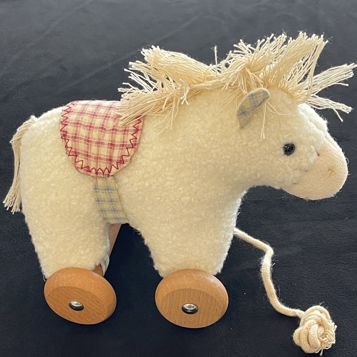 Vintage 1980s Eden Plush Horse Pony Plush Pull Toy Collection Wooden Wheels HTF