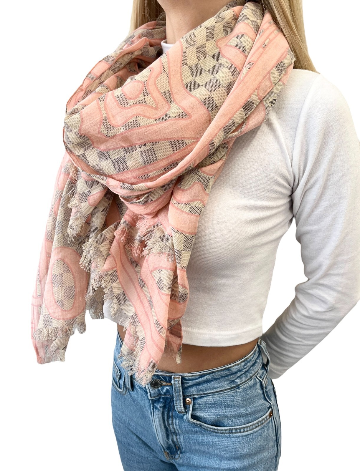 как выглядит LOUIS VUITTON Vintage Damier Azur Tahitienne Logo Scarf Wrap Pink Gray Cotton фото