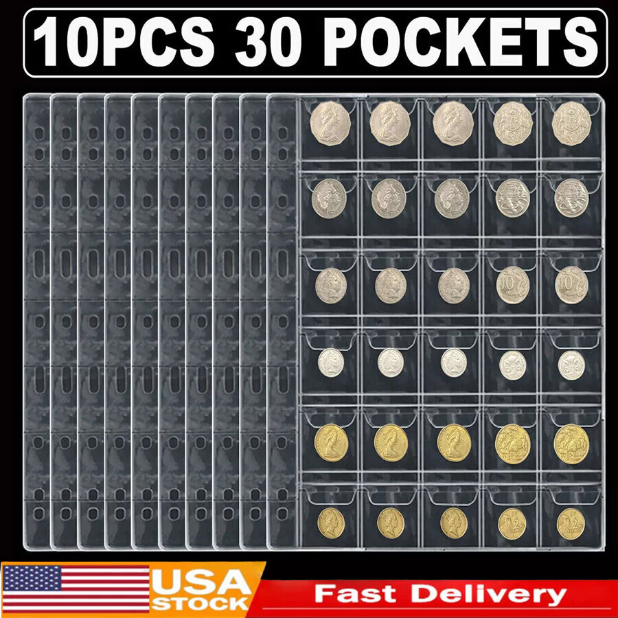 • 10 Sheets Coin Collection Supplies Pages, Coins Collecting Pocket Page 30 pocket