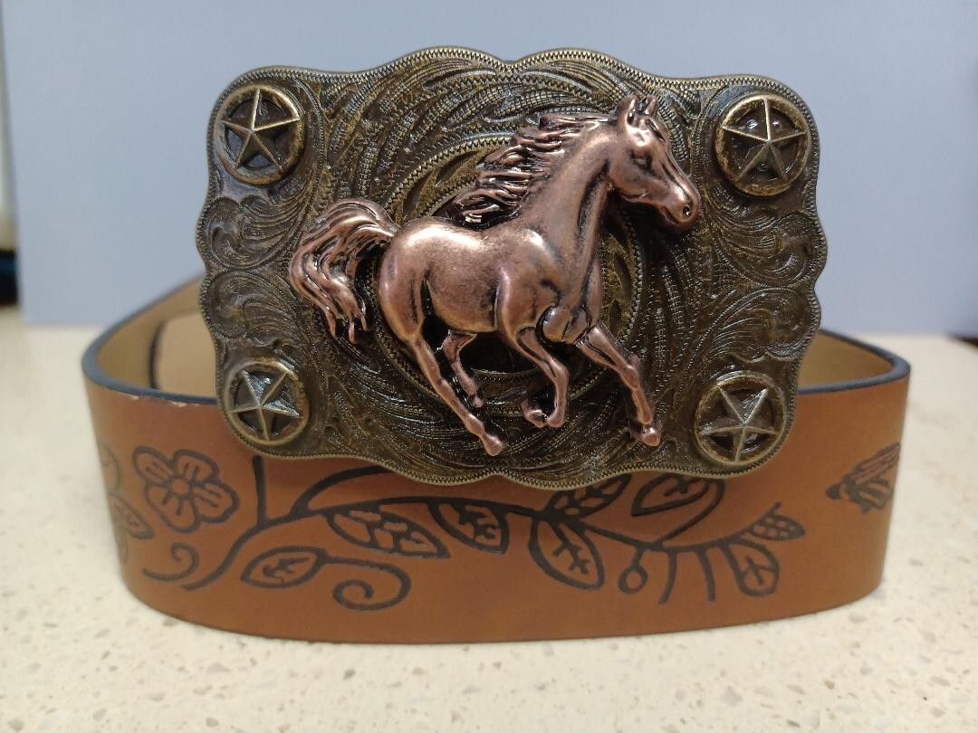 как выглядит WIDE WOMEN MEN WESTERN BROWN LEATHER HORSE BUCKLE BELT belt length is 40 in NEW фото