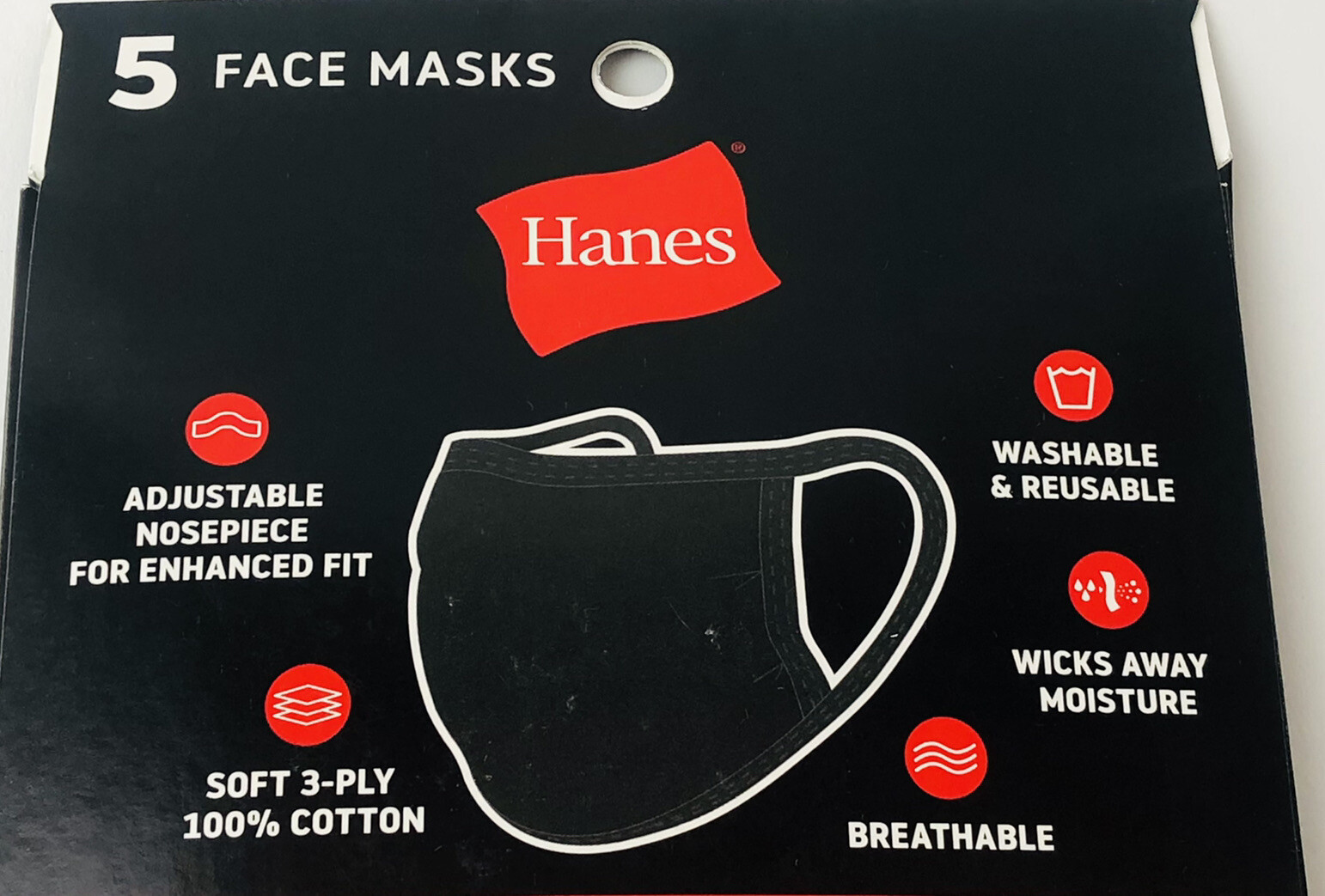 Hanes Black Face Mask 5 Pack 100 Cotton Reusable Washable Cool Comfort Fabric