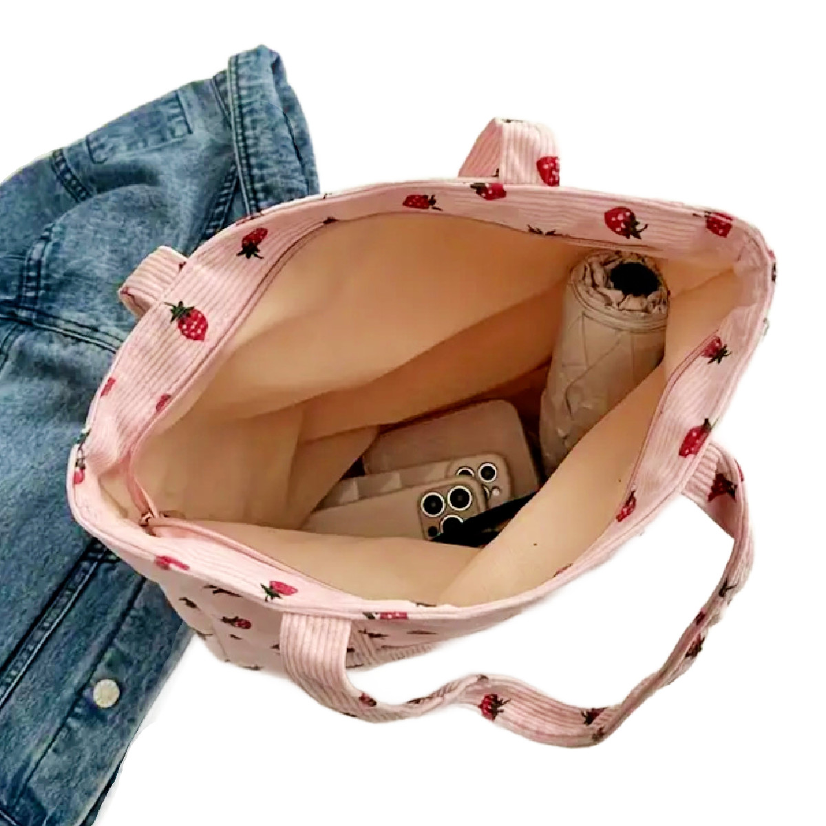 как выглядит Pink Corduroy Tote Bag Strawberry Pattern Large 13"x12" Shoulder Bag Purse New фото