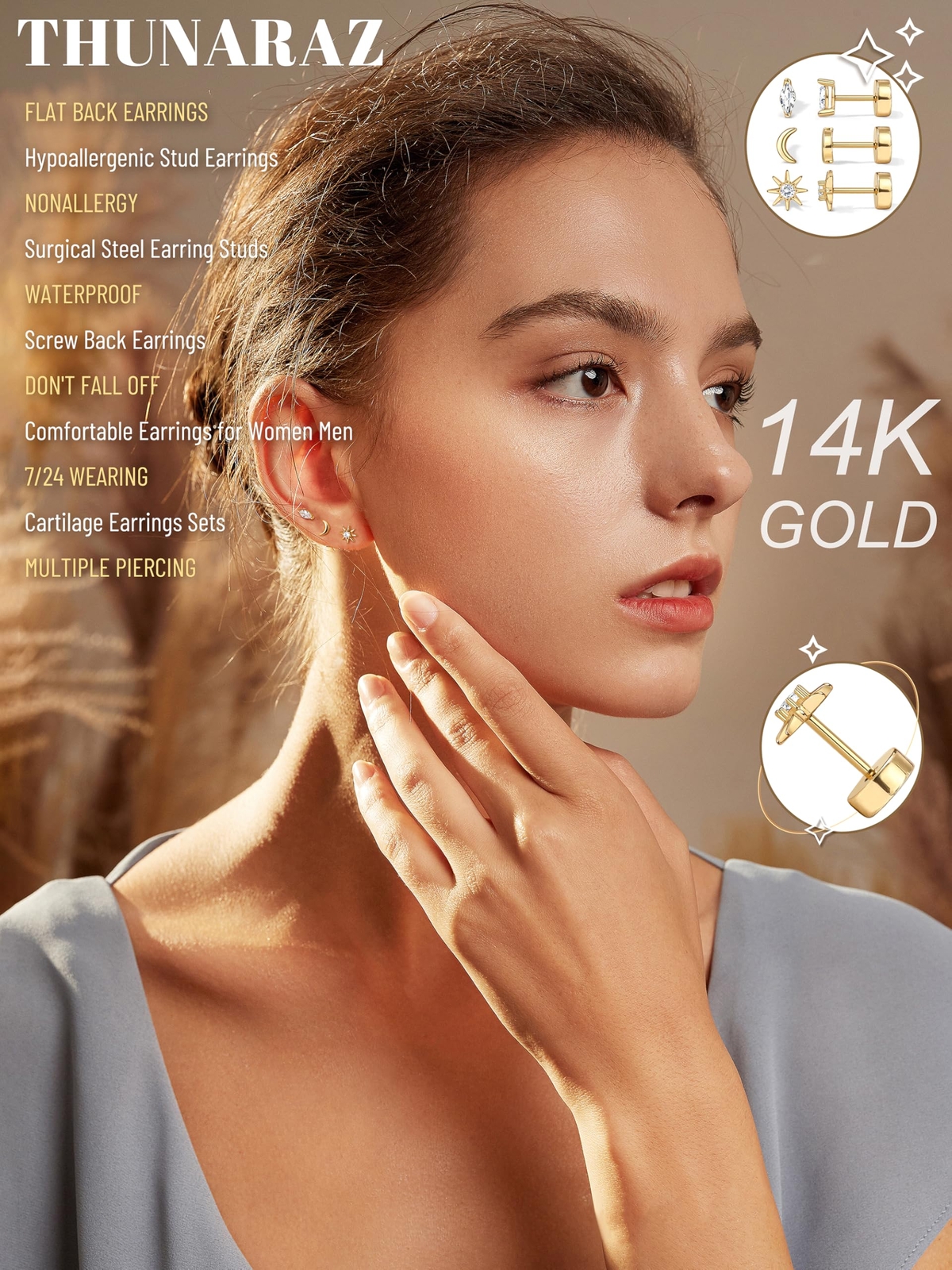 14K Gold Flat Back Earrings for Women Men Dainty Hypoallergenic Surgical Stai...