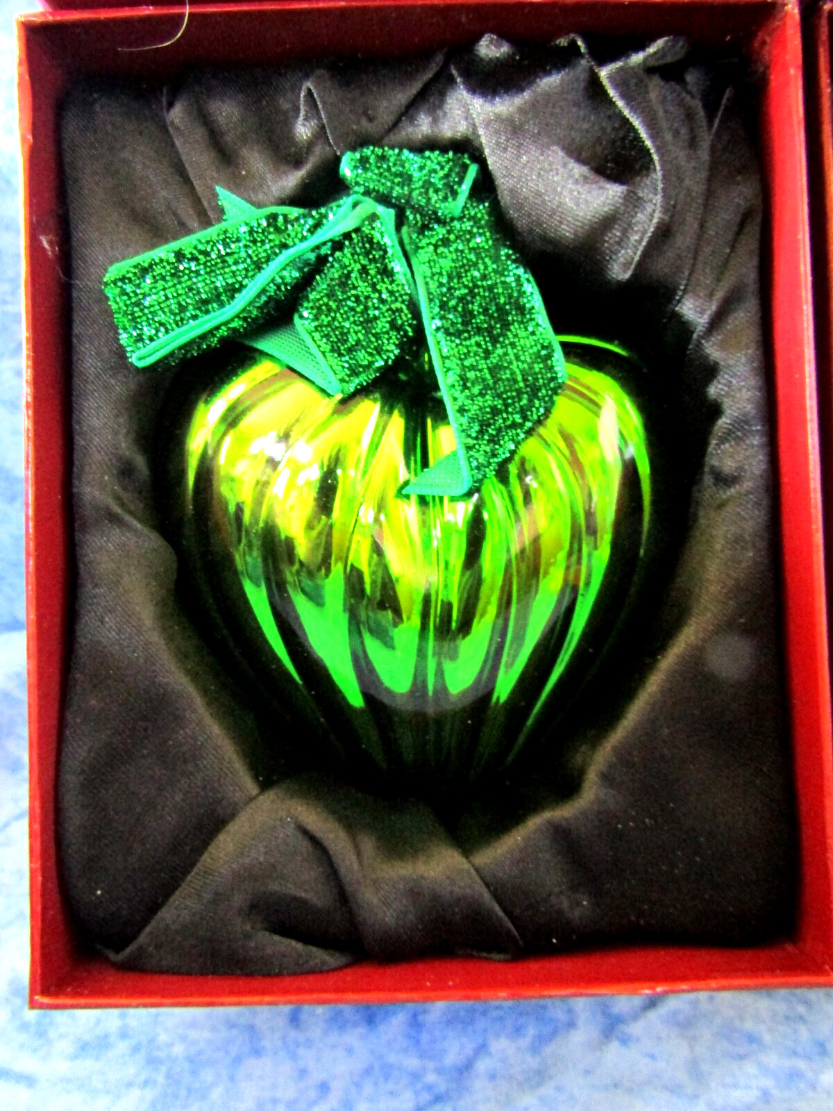 как выглядит Set of Three Heart-Shaped Ornaments in Blue, Green Gold w/Ribbon Hangers - NIB фото