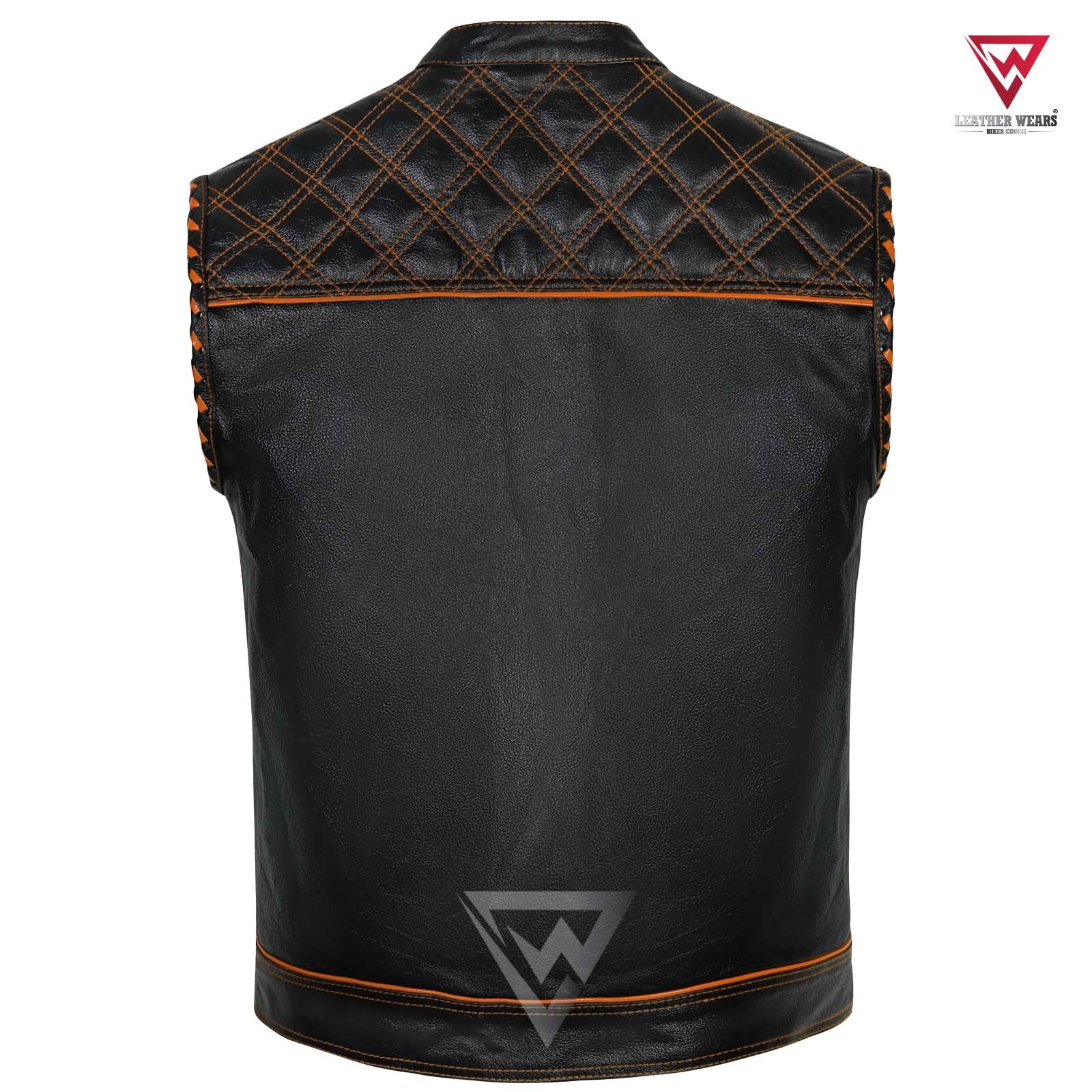 как выглядит Mens Black Leather Biker Vest Orange Paisley Lining Club Style Custom Stitch фото