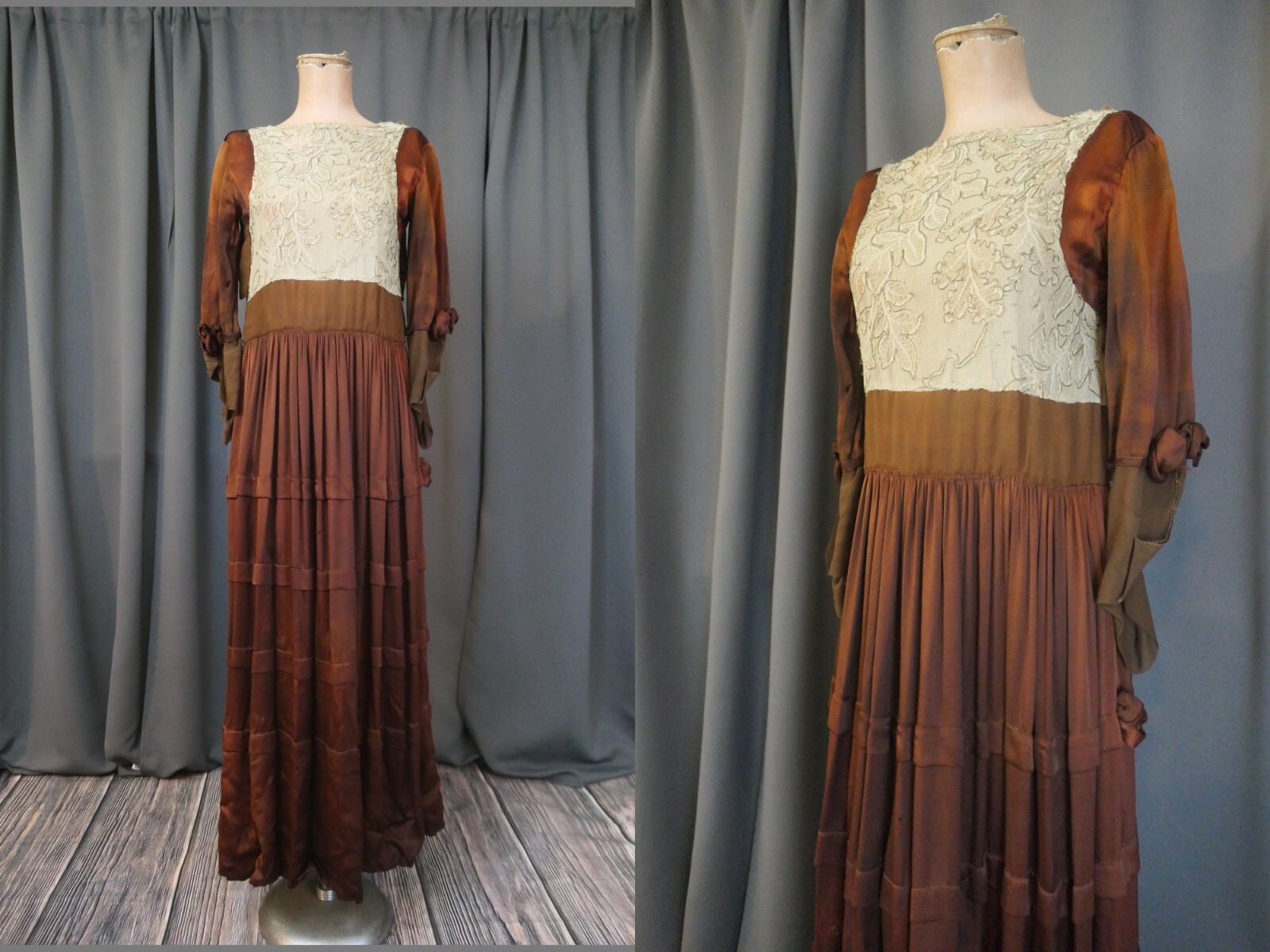 Edwardian Brown Silk Lace Dress, 1900s Antique Gown, Damaged, Display Study