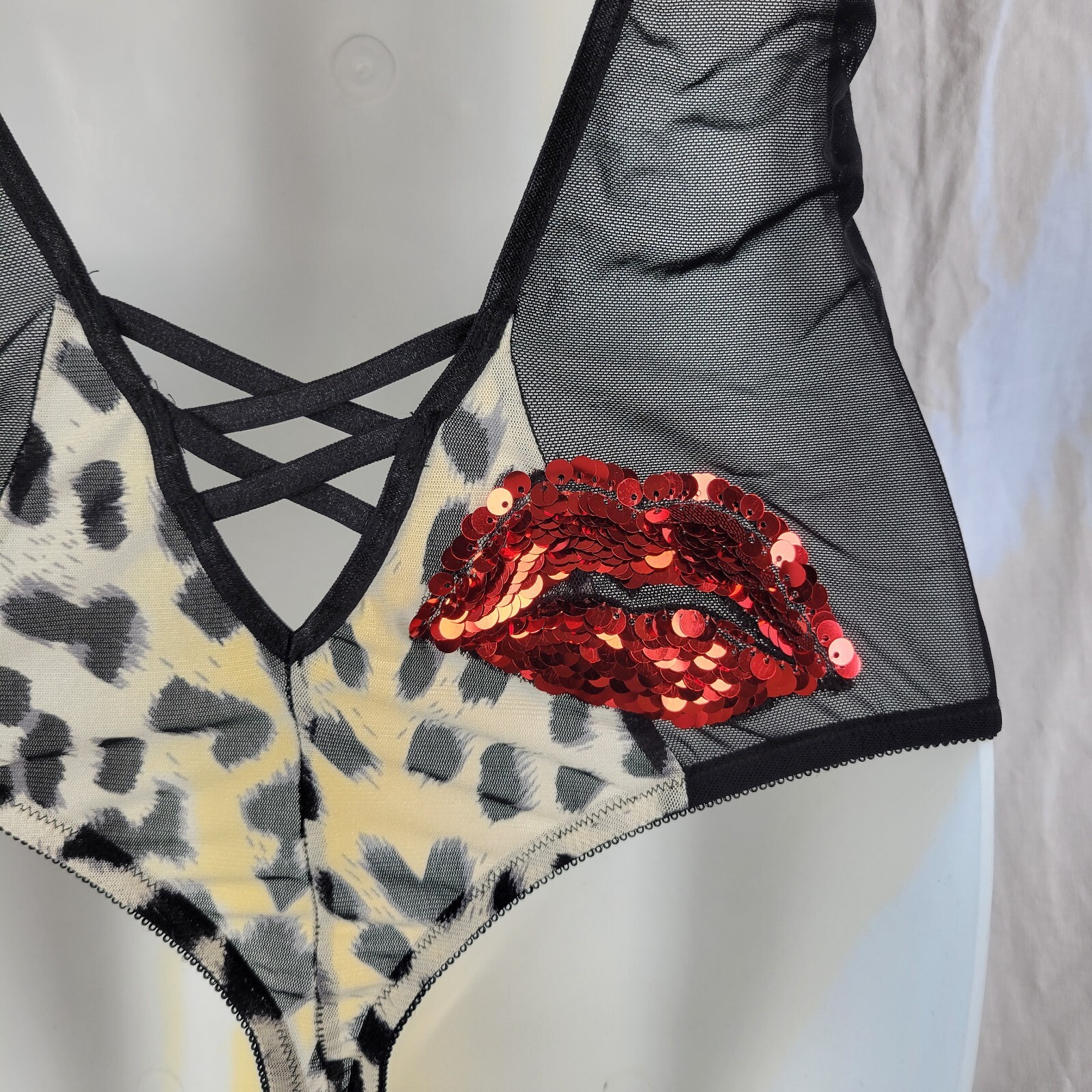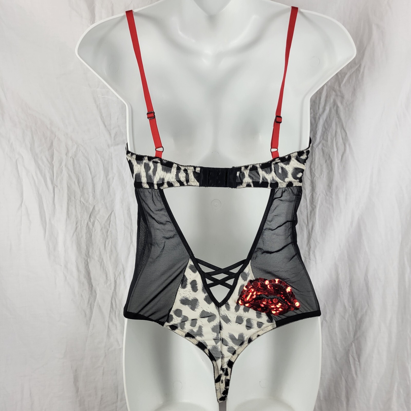 Frederick's of Hollywood Bodysuit Teddy Snow Leopard Print Sequin Lips Size L