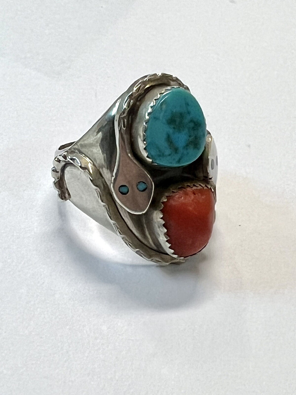 Sterling Silver Snake Eyes Ring Turquoise And Coral 11.5