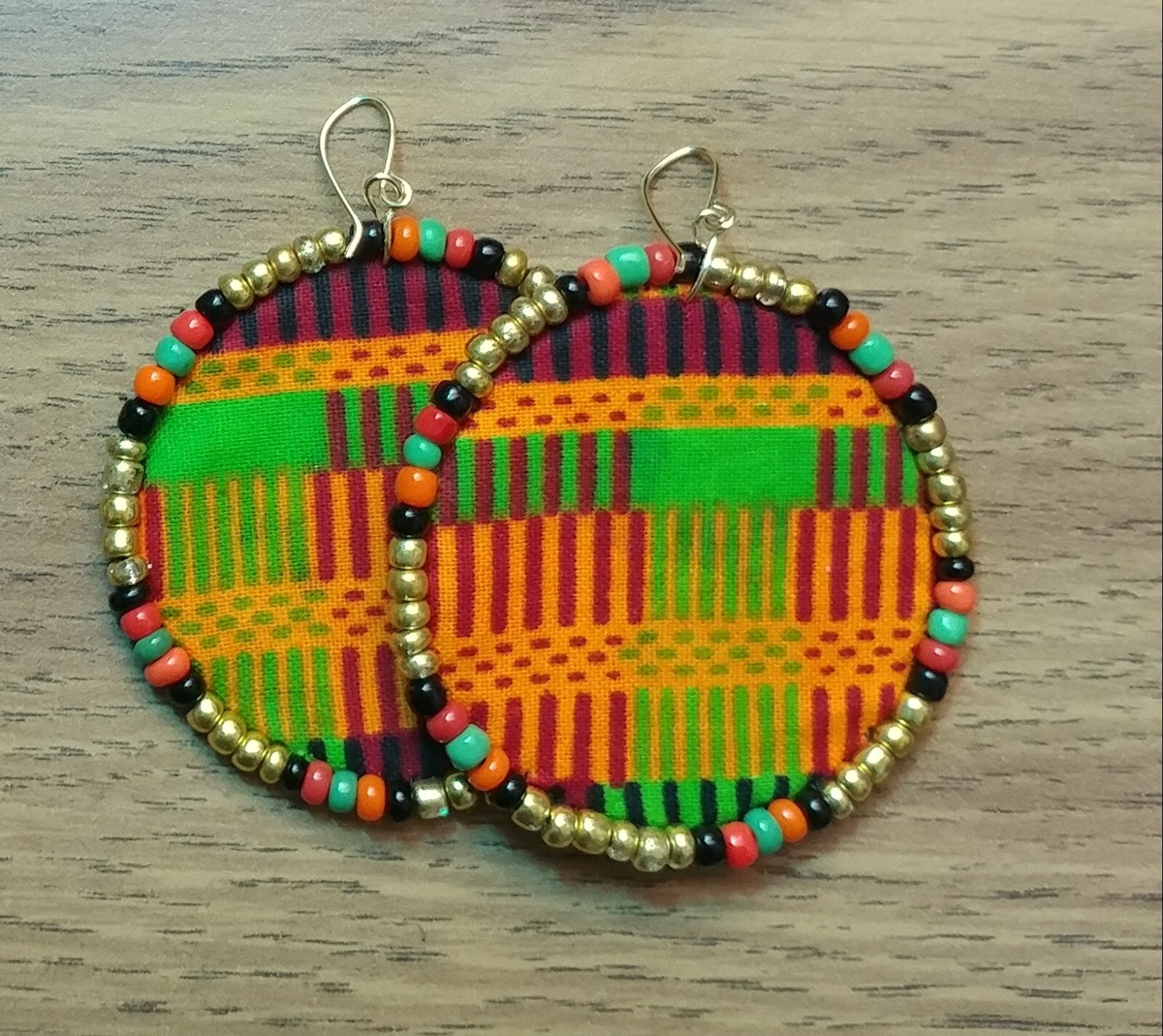 African Beaded Kinte Cloth Fabric Earrings Large Handcrafted