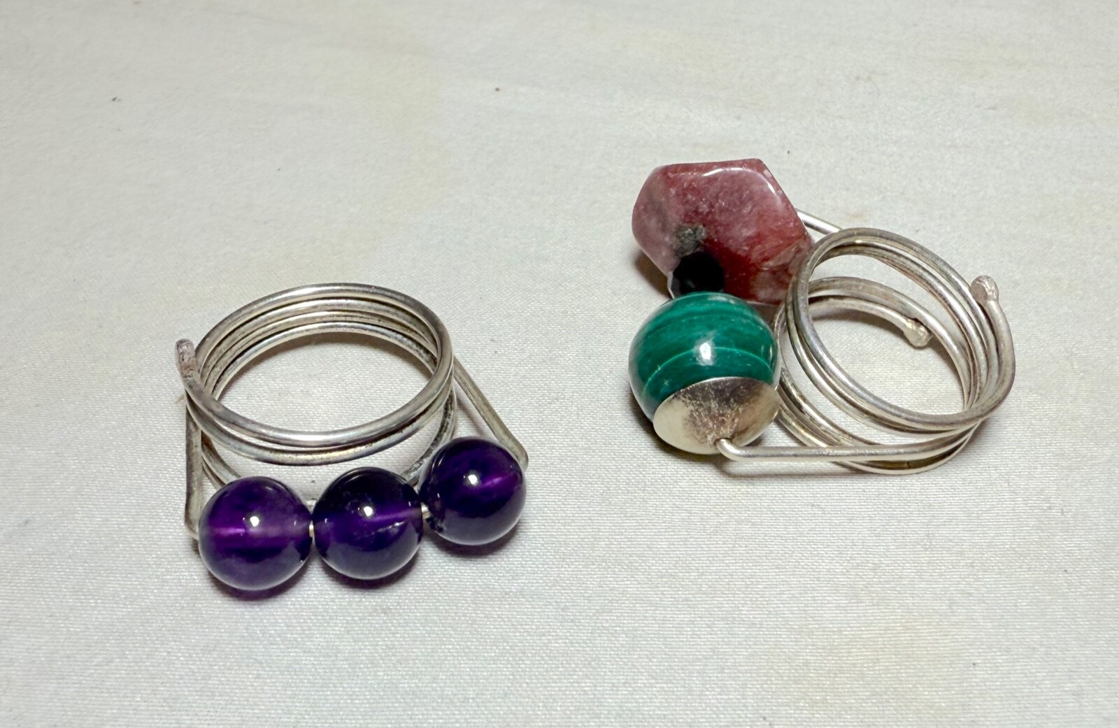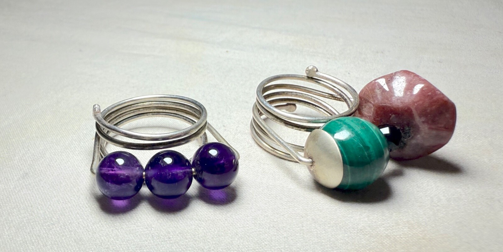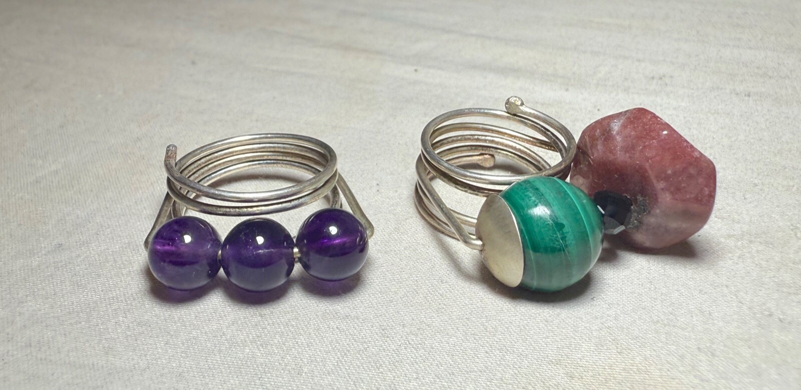 2 vintage L Connors artisan sterling silver amethyst malachite onyx modern rings