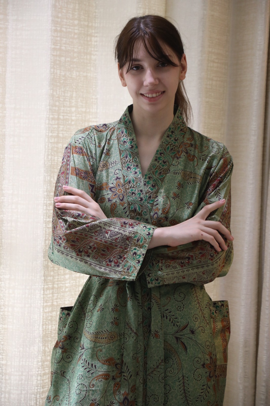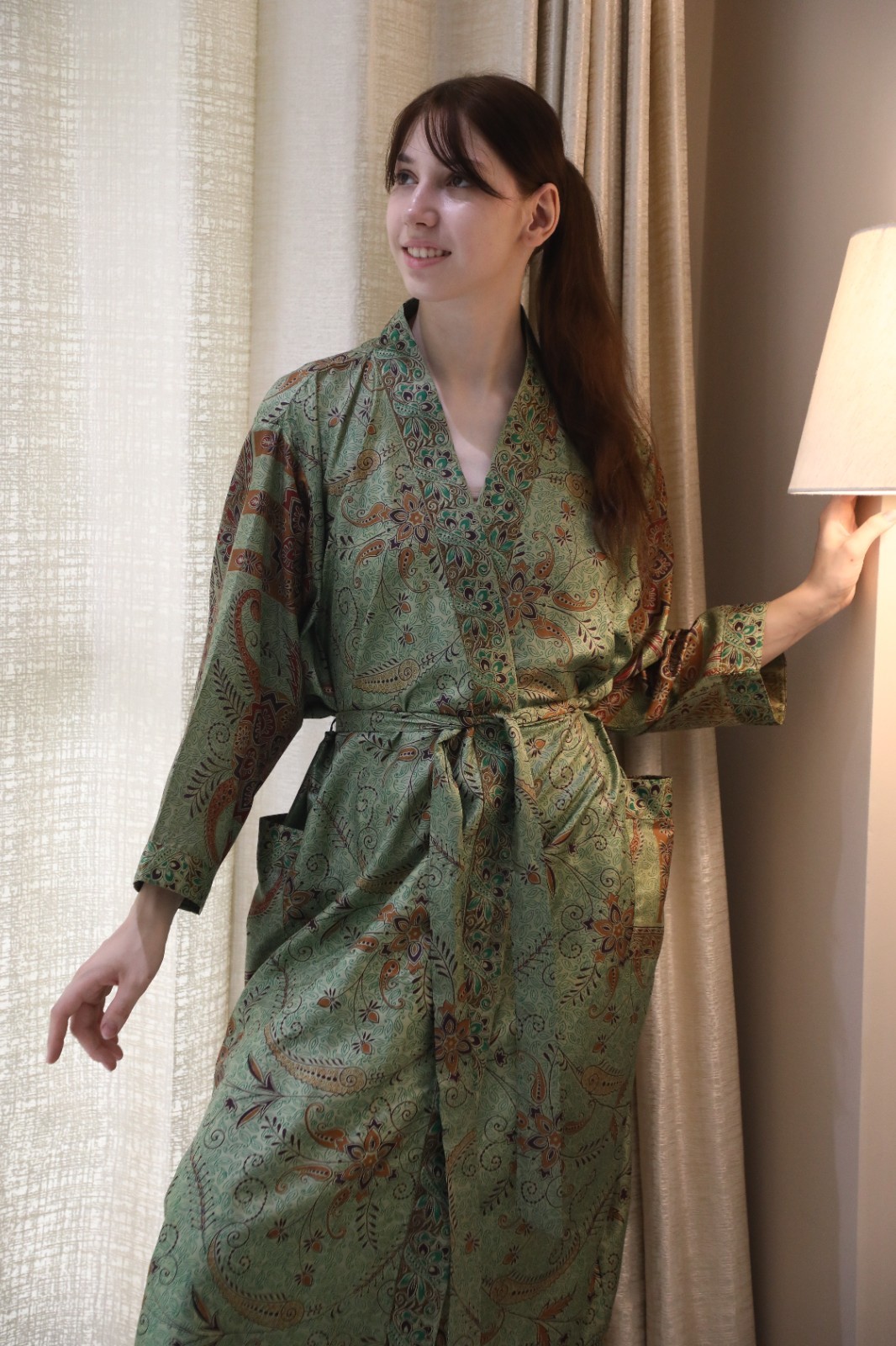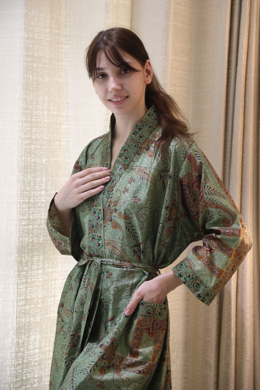 как выглядит Pure Silk Green Black kimono Long Robe Gown Woman Silk Robe Kimono PS KMO5143 фото