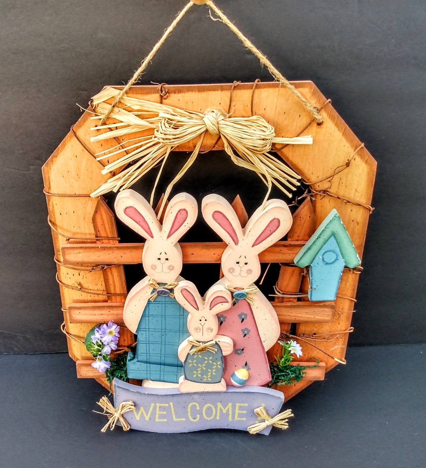 Happy Easter Wood Welcome Sign 3 Bunnies Door Wreath Wall / Table Top Home Decor