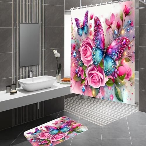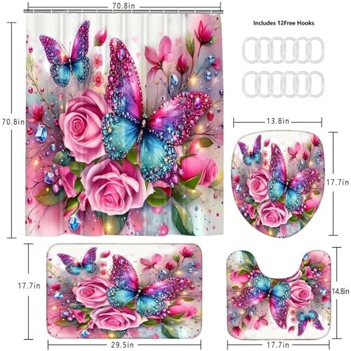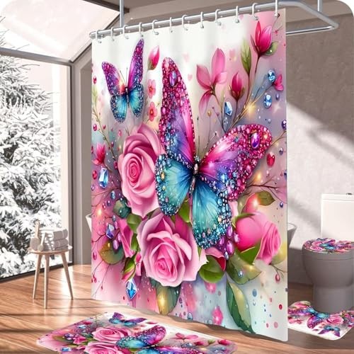 4Pcs Pink Glitter Floral Shower Curtain Set Rose Bathroom Sets Butterfly Red