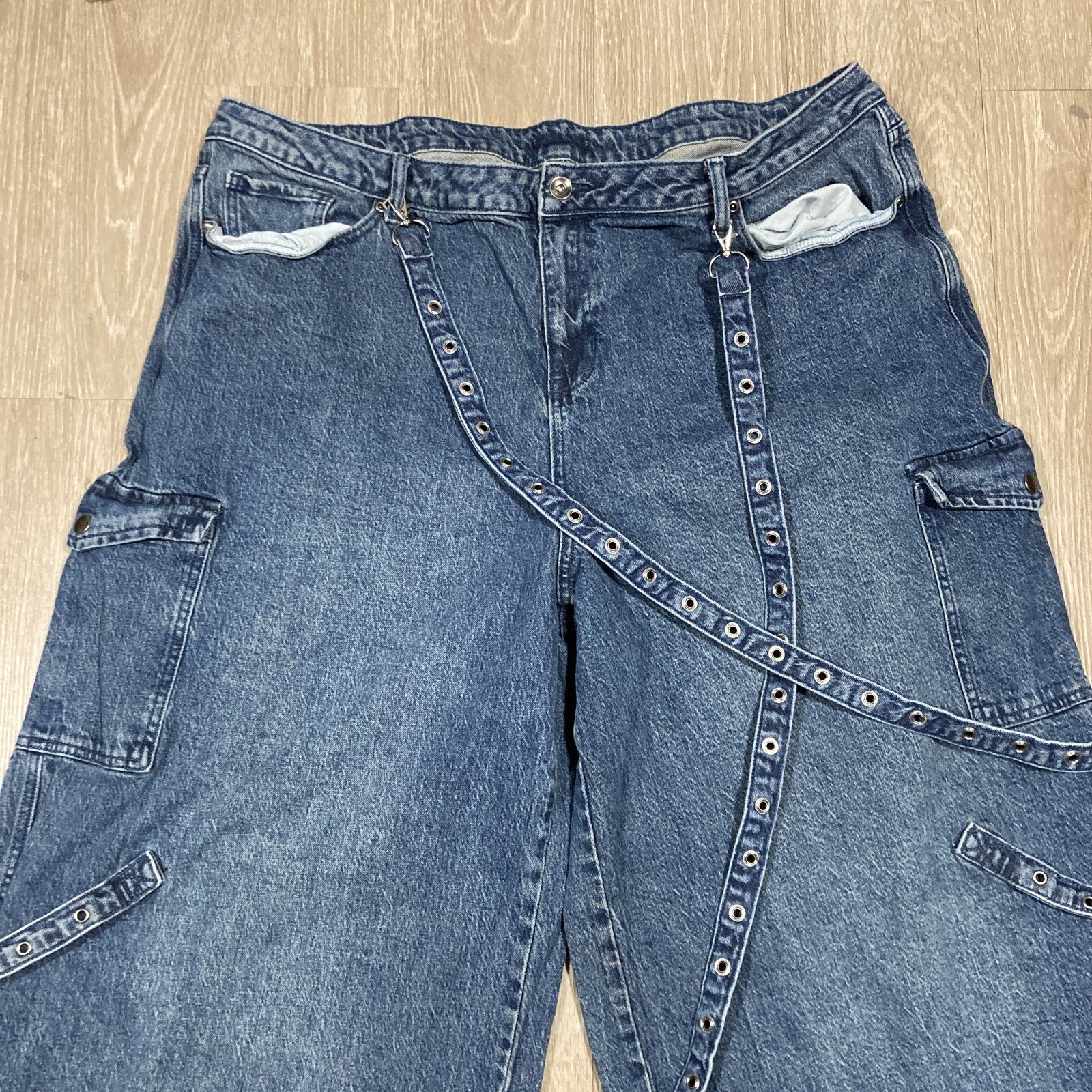 как выглядит Rave Pants 38 90s Y2k Wide Leg Skating Skater Skate Baggy Straps Denim Jean Pant фото