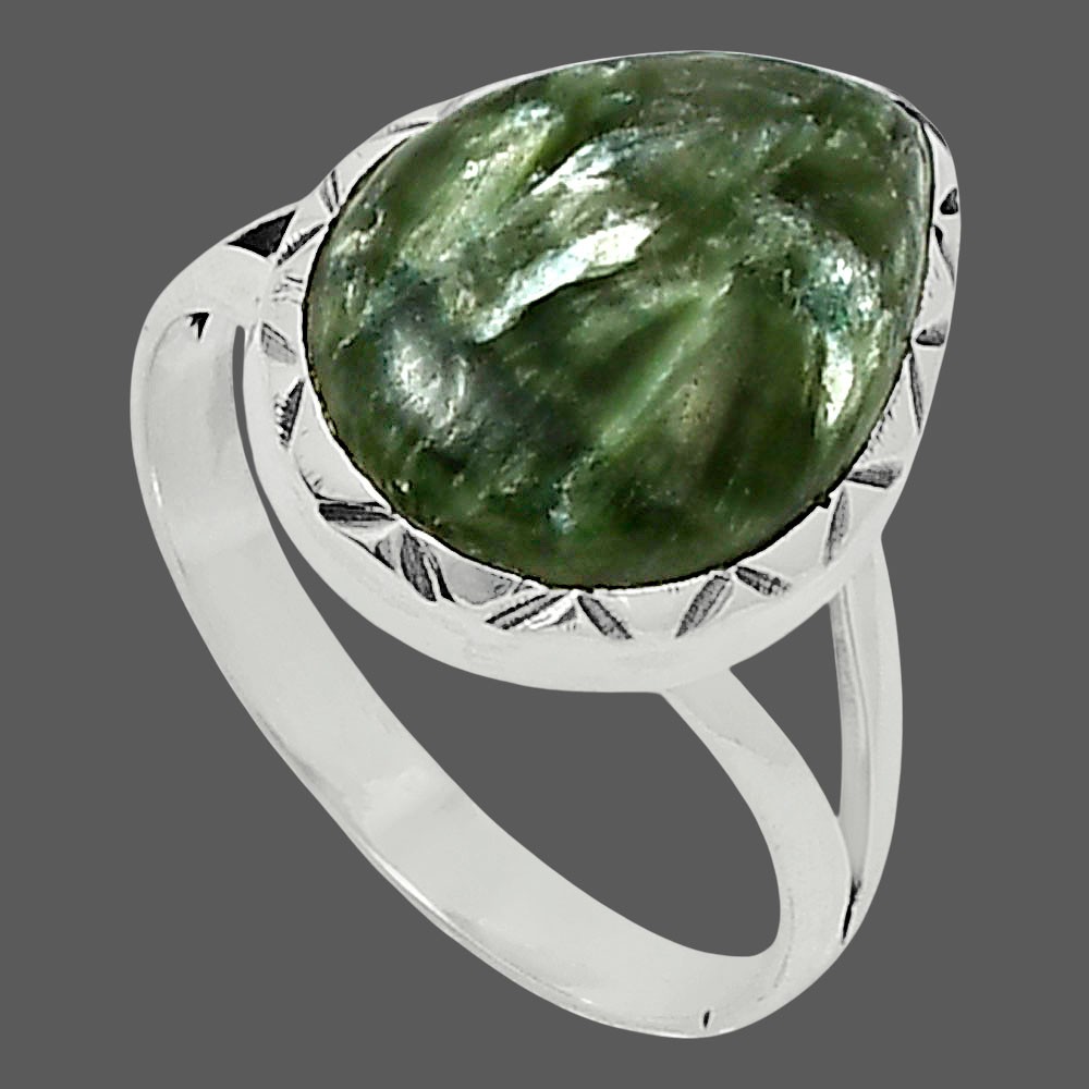 Premium Russian Seraphinite 925 Silver Ring s.9 Natural Green Gem R-1074