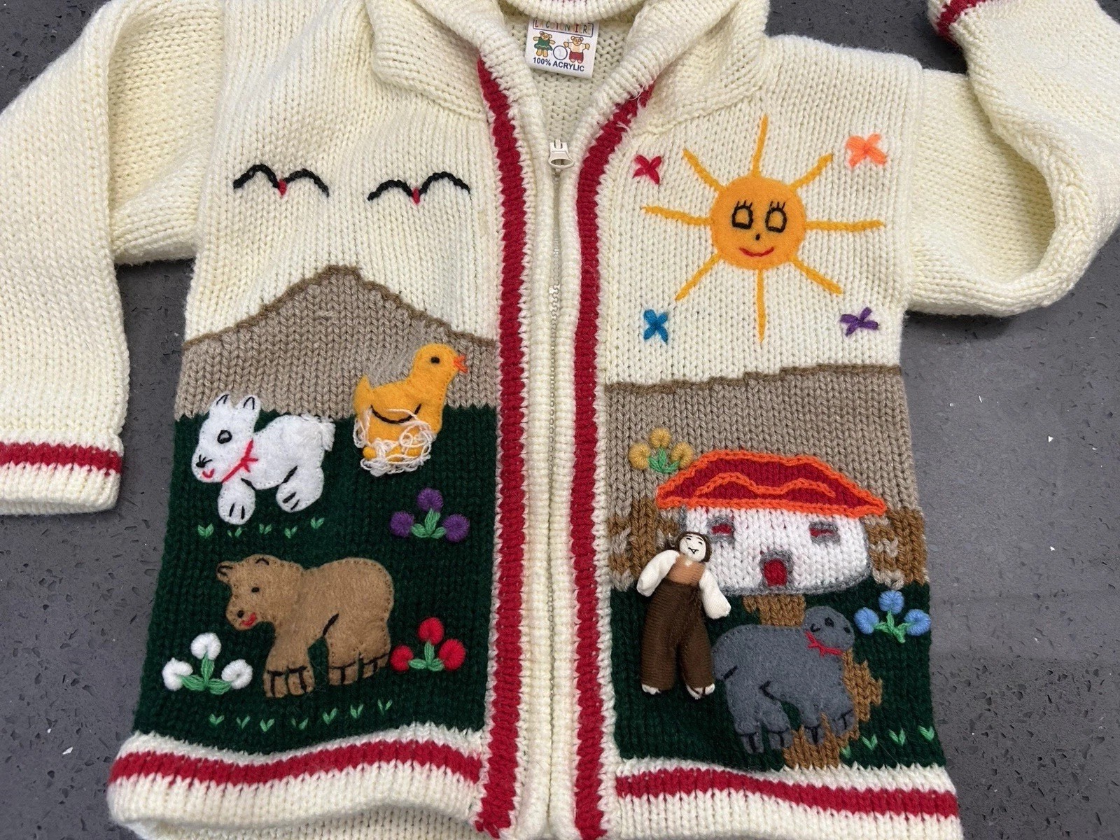 как выглядит Vintage Full Zip children s Knit Sweater Hooded Toddler Farm Animals Sun Hood фото