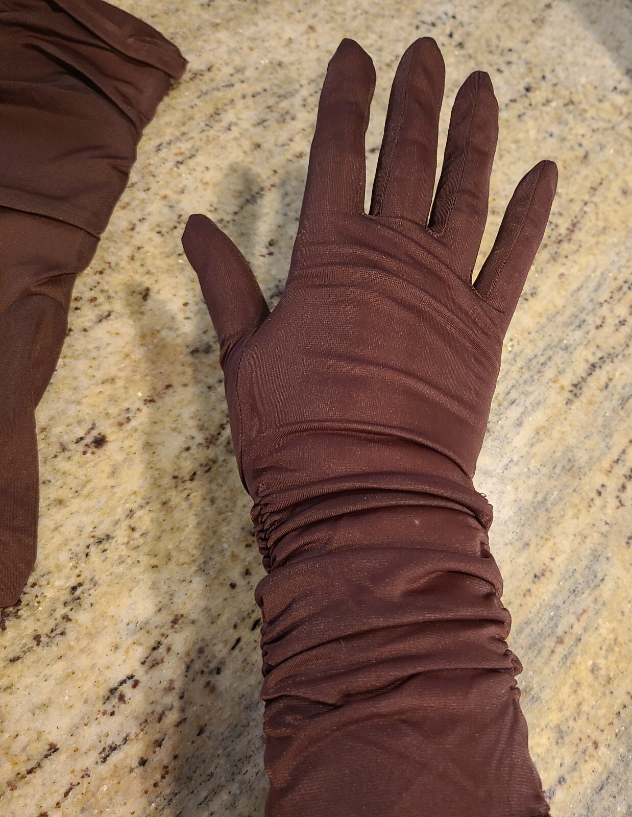 как выглядит New Vintage Size L Brown Stretch Nylon Formal Long Gloves Ruched Tufted Look фото