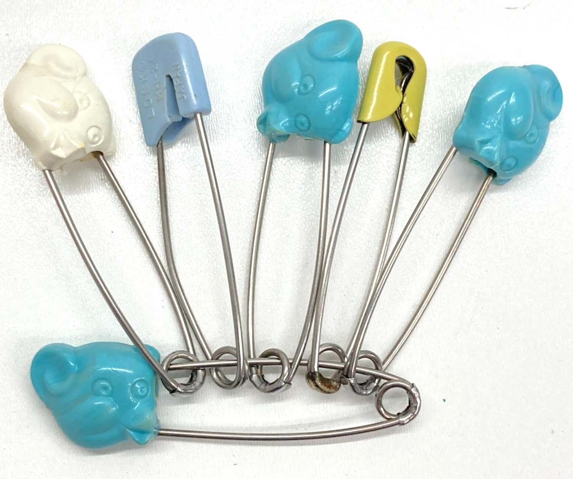 Lot Of 6 Vintage Japan 50's Teddy Bear baby Diaper Pins Blue white Yellow