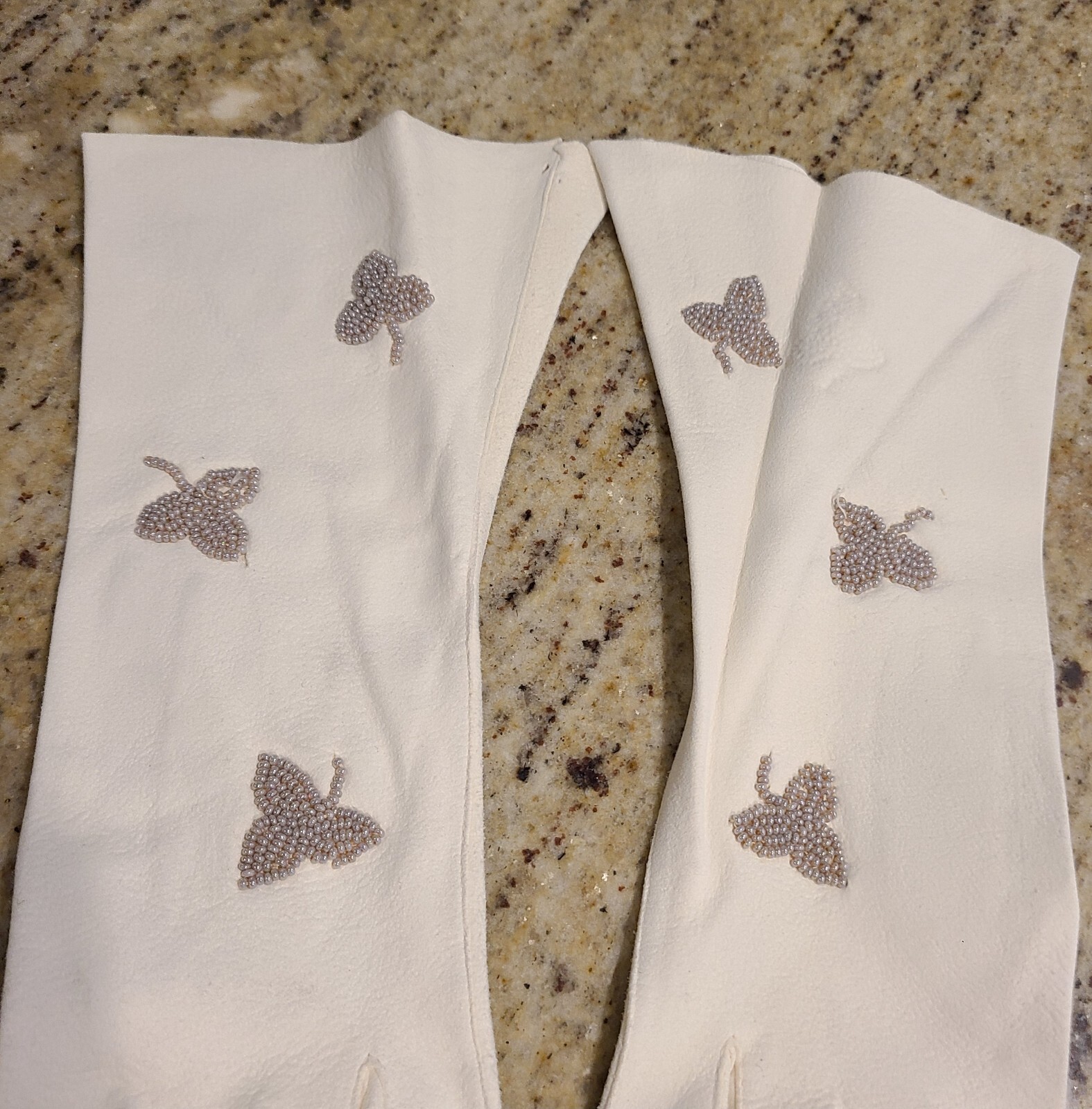 Vtg Womens Size L Off-White Thin Suede Formal 11 Long Gloves Beaded Leaf