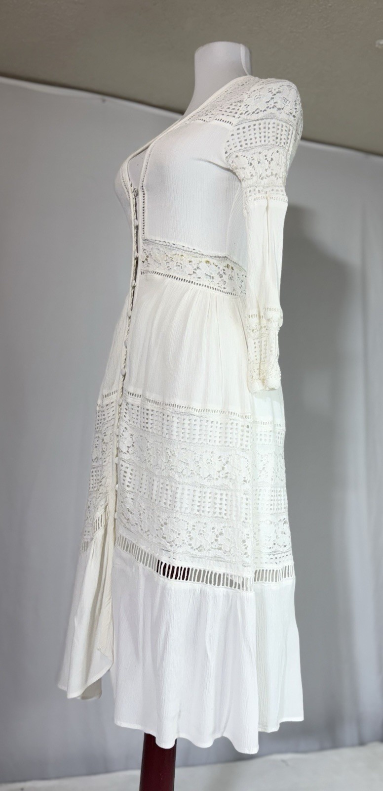 Vtg Boho Midi Crochet Lace Cream Dress 3/4 Sleeve Stretch Lined Button Up Sz XS