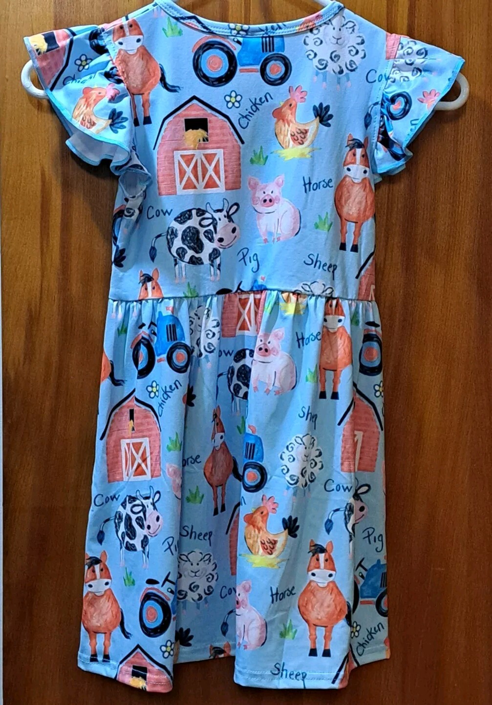 Girls Dress Blue Animal Print Cows Chickens Farm Barn Pig Sheep Horse 5 - 6 Year