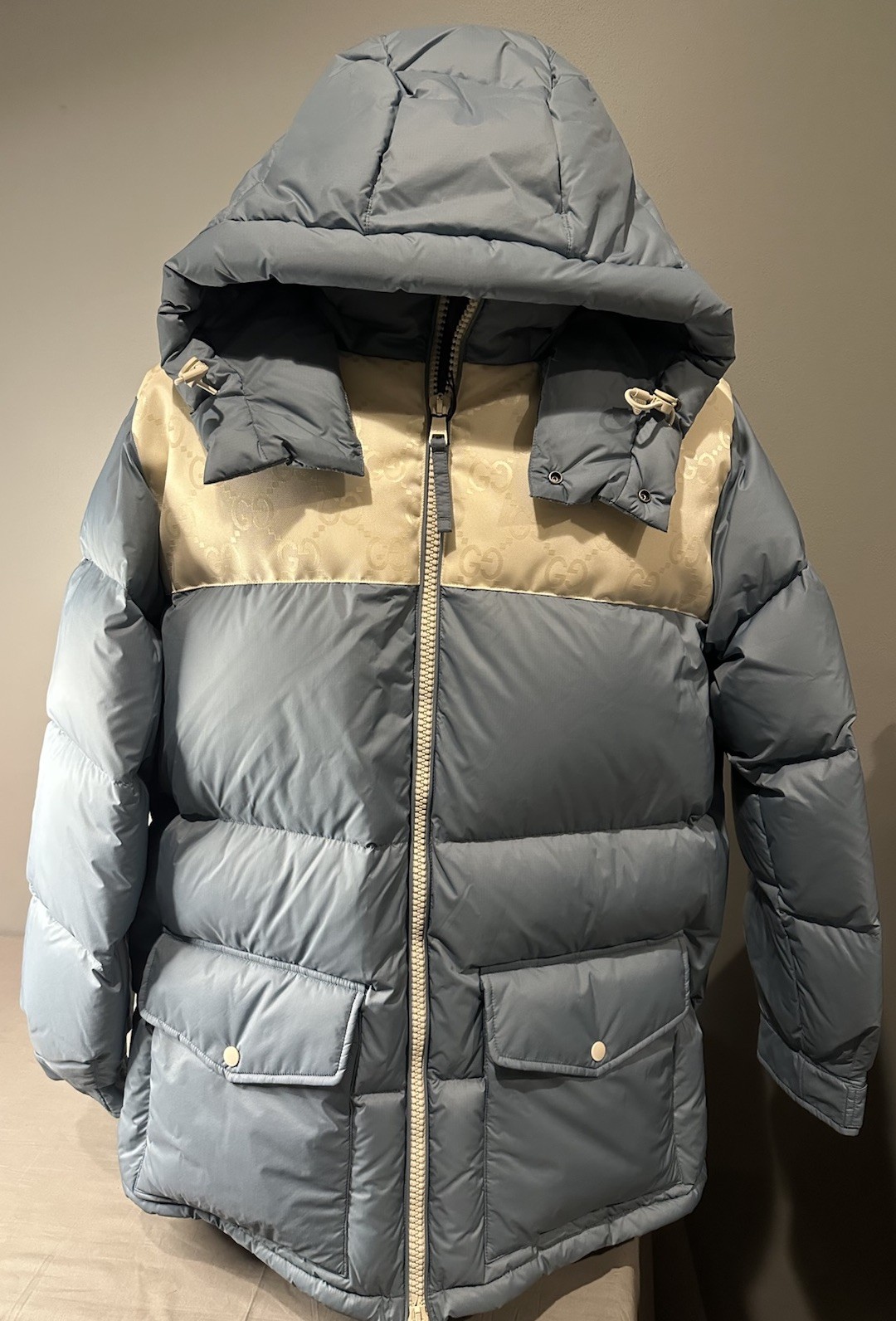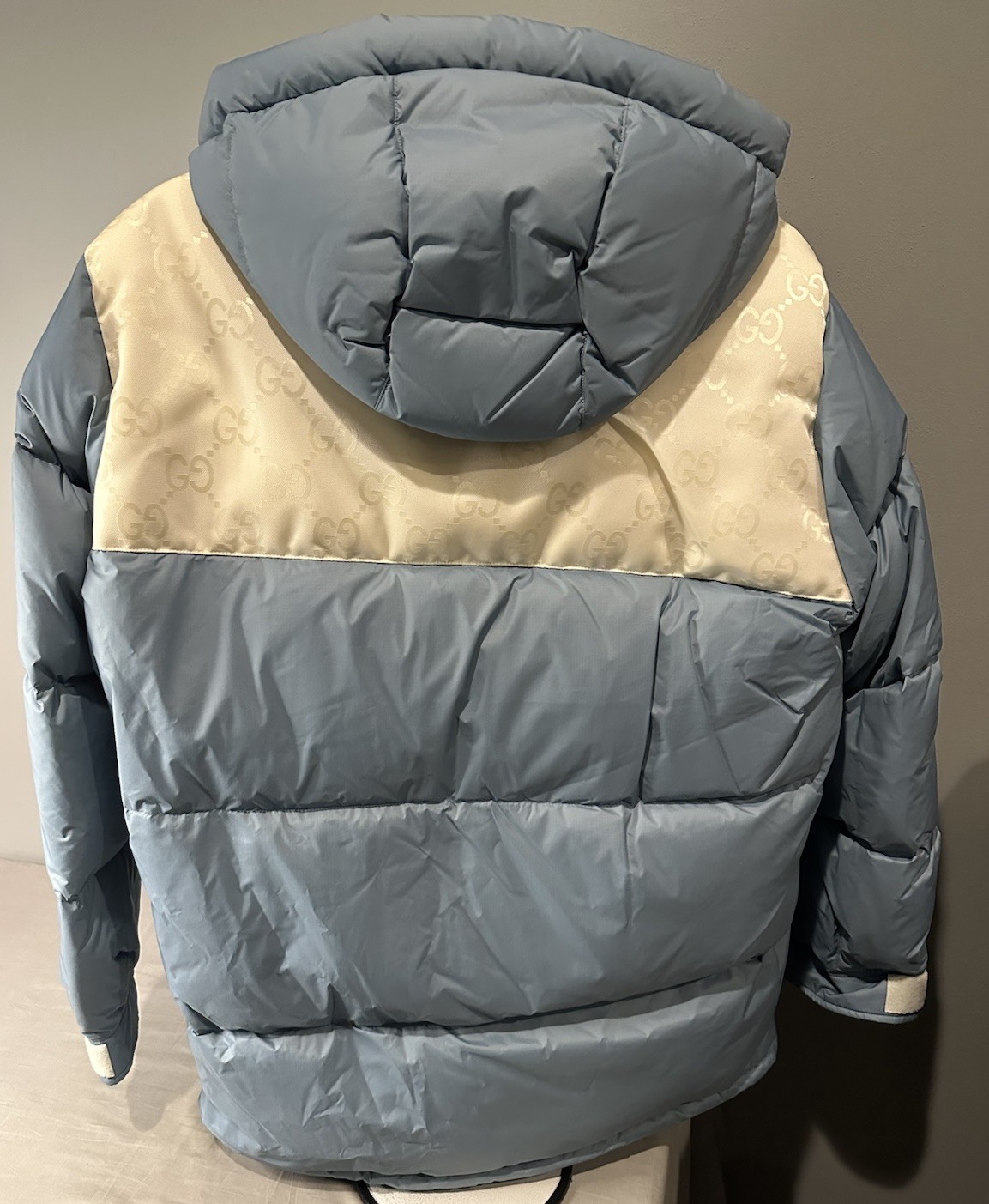 как выглядит Gucci GG Logo Goose Down Puffer Jacket Blueish Grey Coat Men s Sz 48 Authentic фото