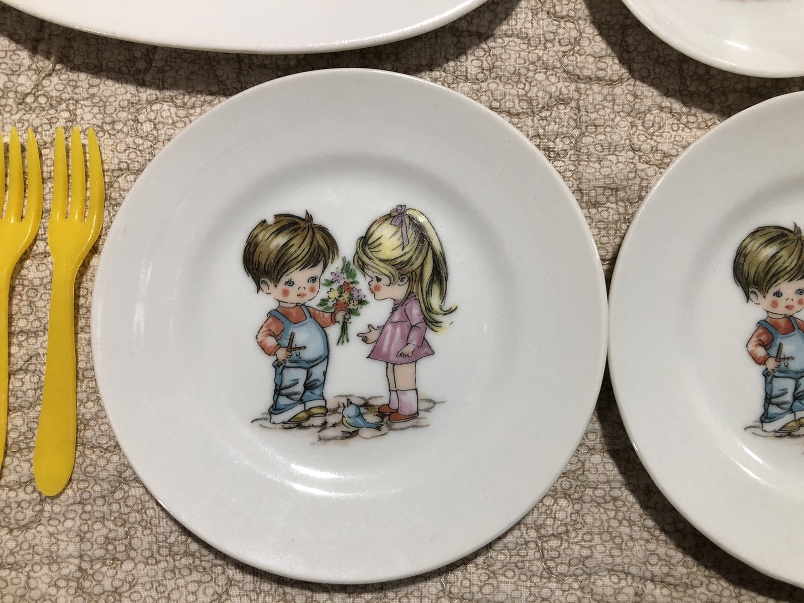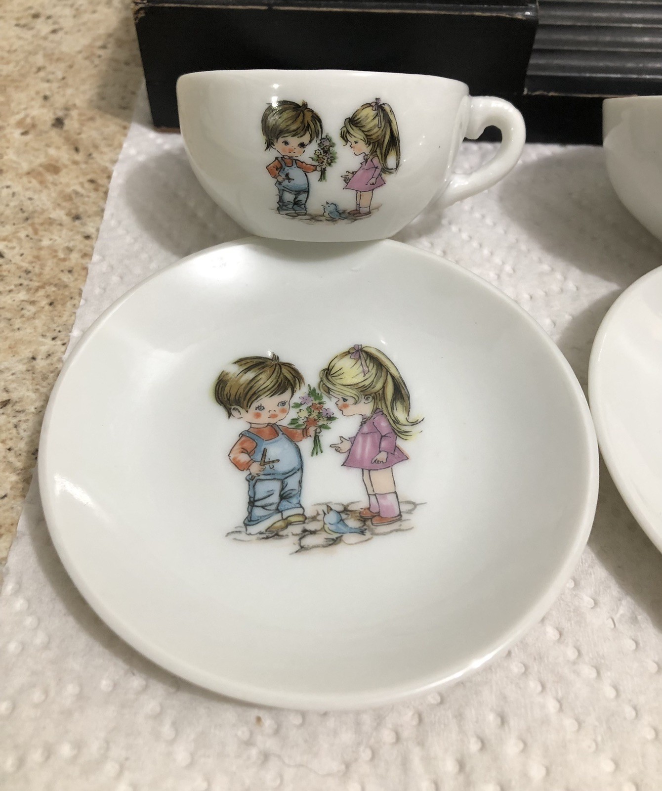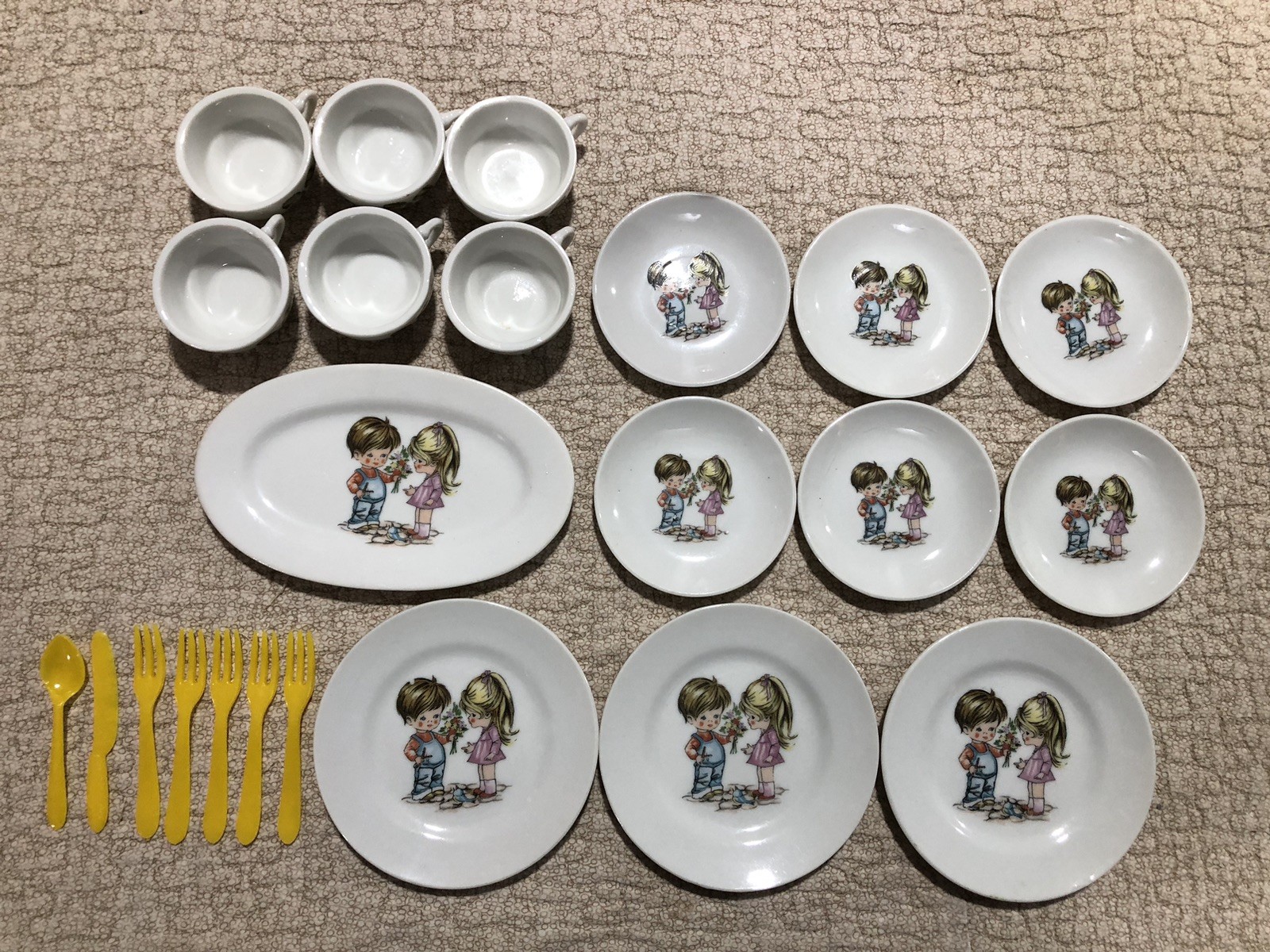 Vtg JAPAN 1950s Childs 23 PC Ceramic Mini Toy Tea Set - Boy Giving Girl Flowers