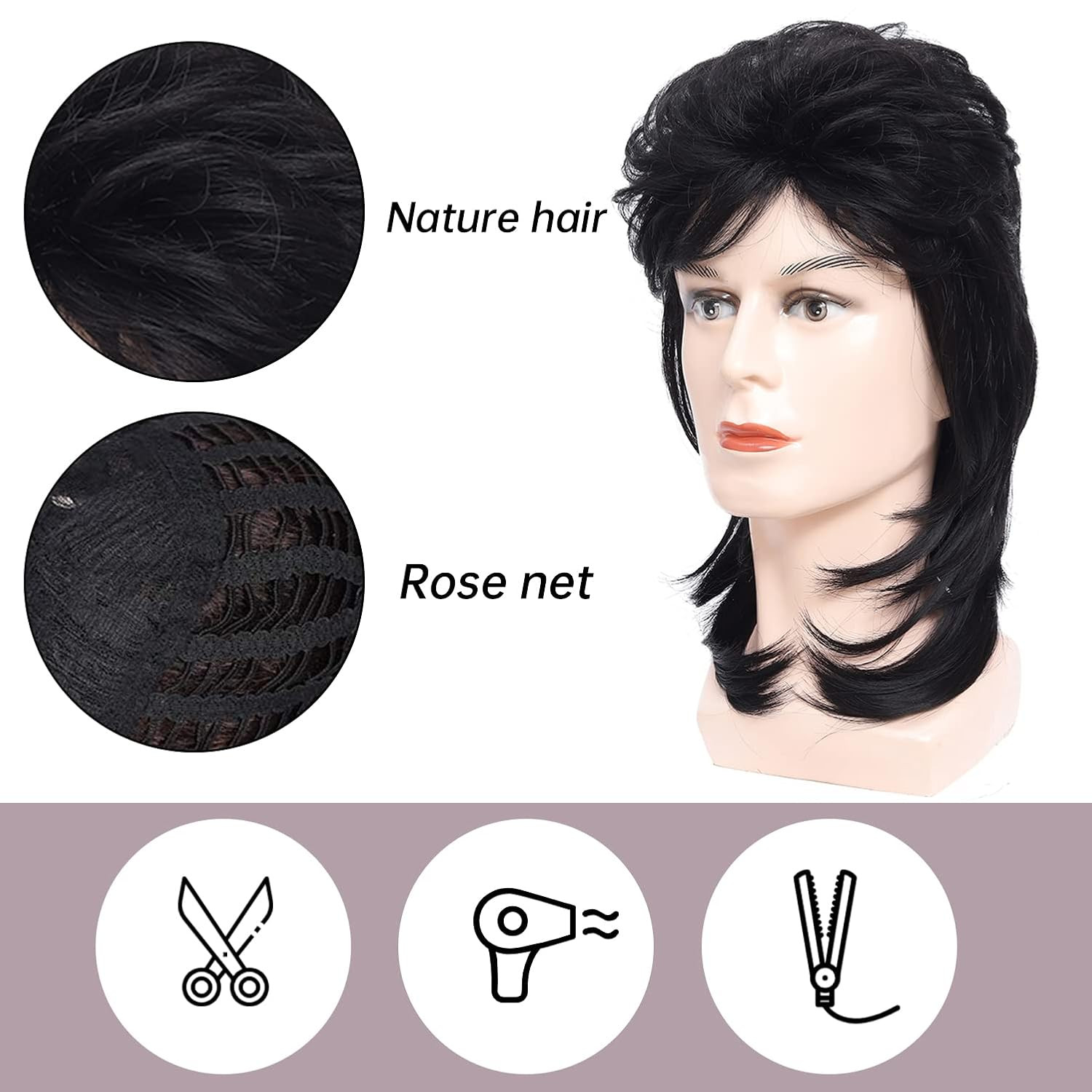 Mullet Wig for Men, Black, 80S Costume Accessory, Cosplay, Halloween