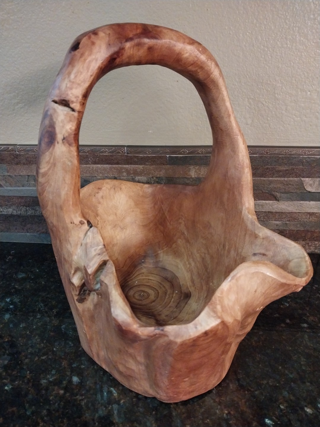 HAND CARVED TREE BURL WOOD BASKET BOWL WITH HANDLE MEDIUM SIZE