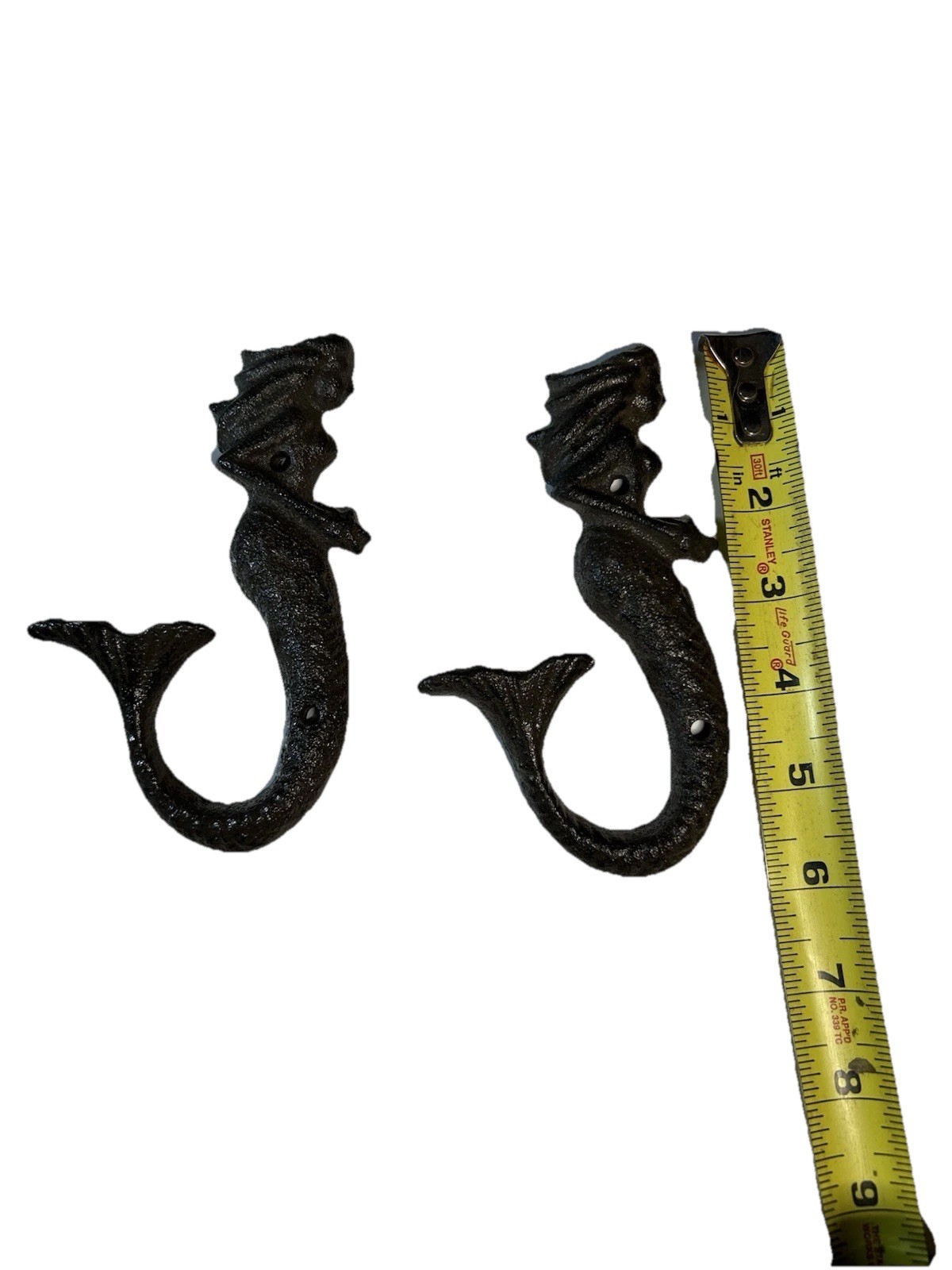 2 Mermaid Cast Iron Hook Wall Beach Towel Coat Nautical Rustic 6 Hanger Metal