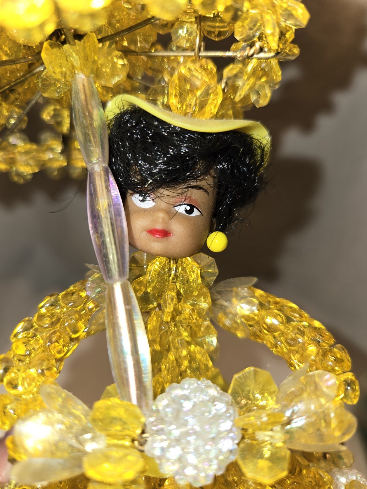 как выглядит RARE Pair Safety Pin Bk Doll Beaded Kitschy 1970s Umbrella Hat Painted Face Vtg фото