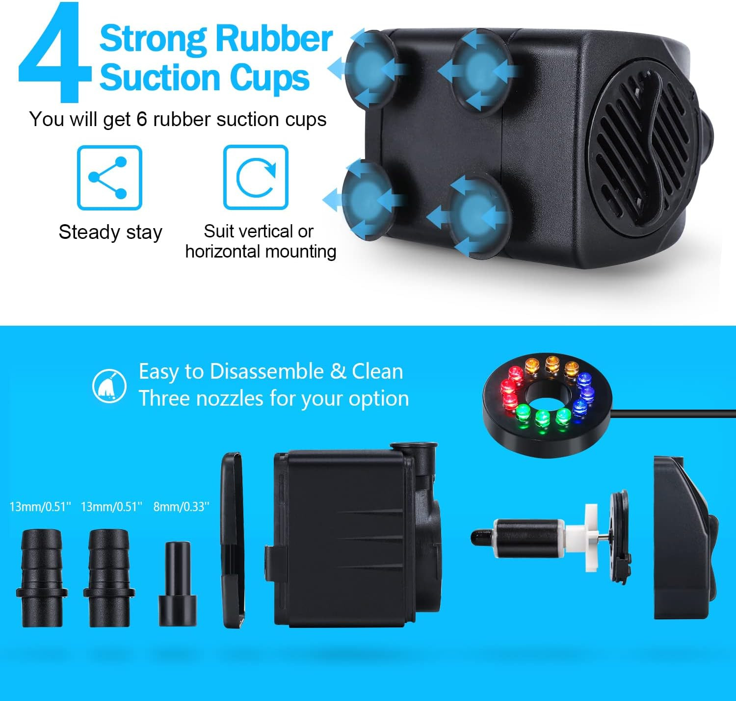 Included Components: pump with light, nozzles, suction cups, tubing