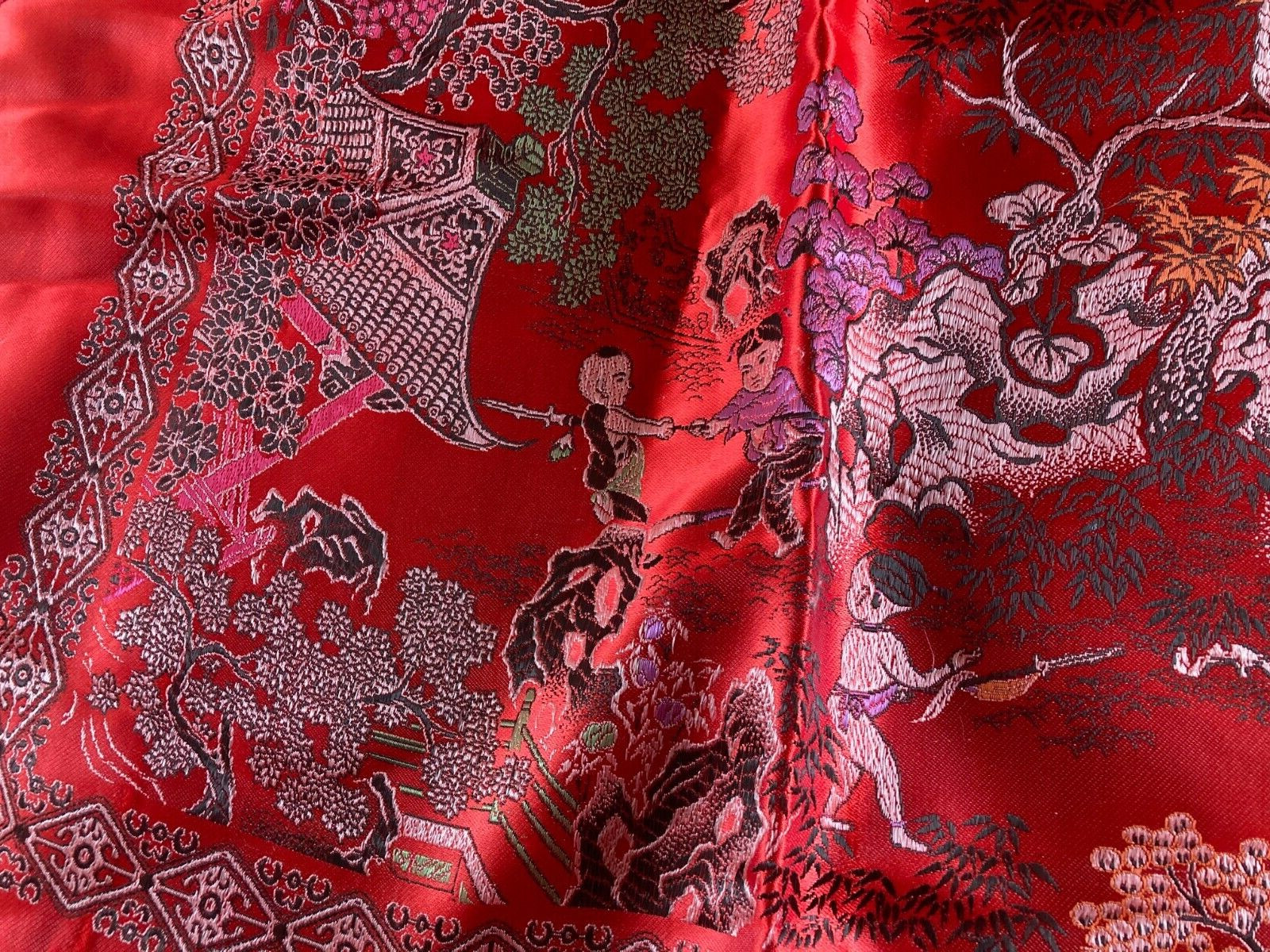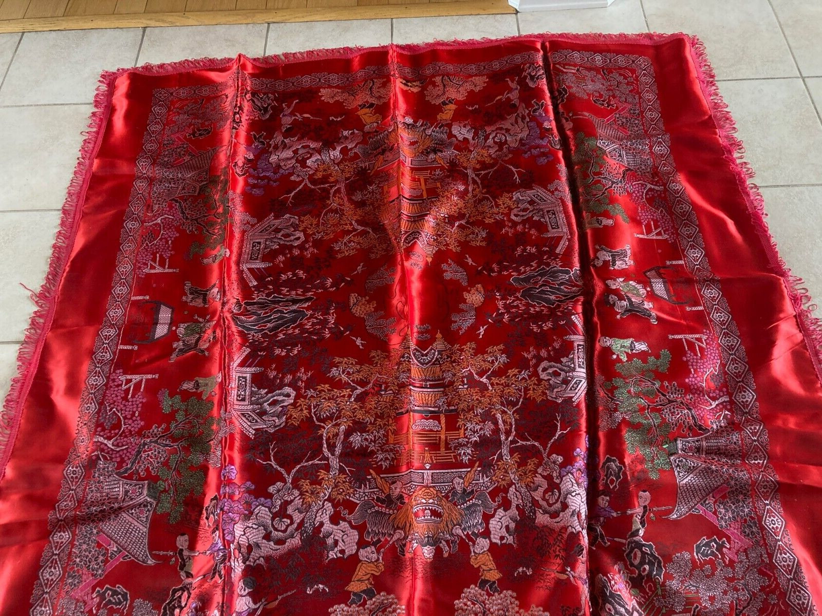 как выглядит Vintage Silk Brocade Piano Shawl Red 58" Excellent w Fringes WWII Tapestry фото