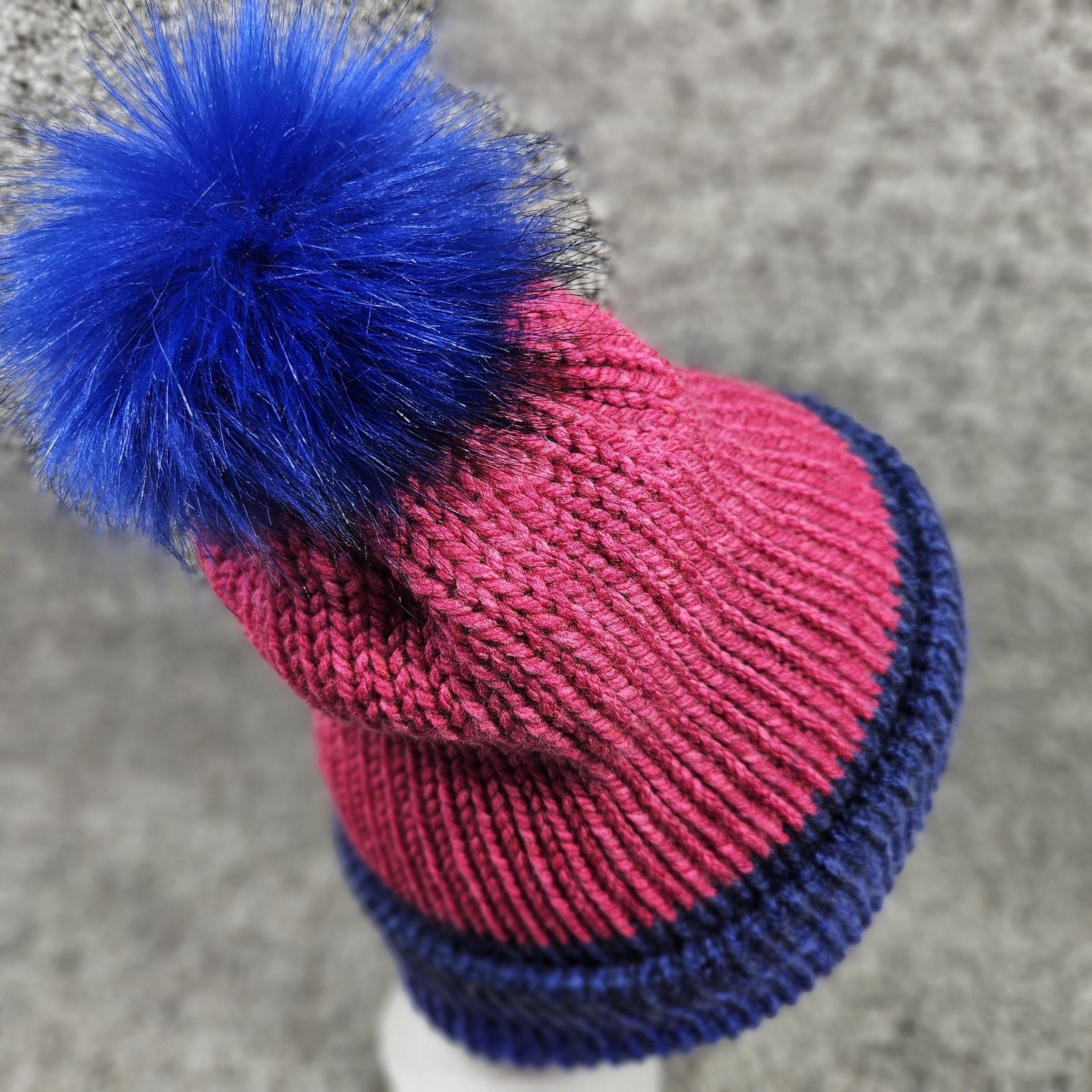 как выглядит Knit Hat Beanie Toque Toboggan Pink Blue Ribbed Winter Warm Size L Pom Handmade фото