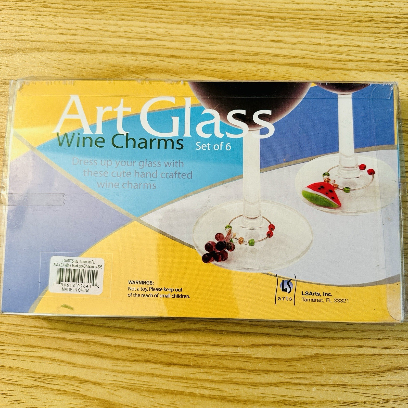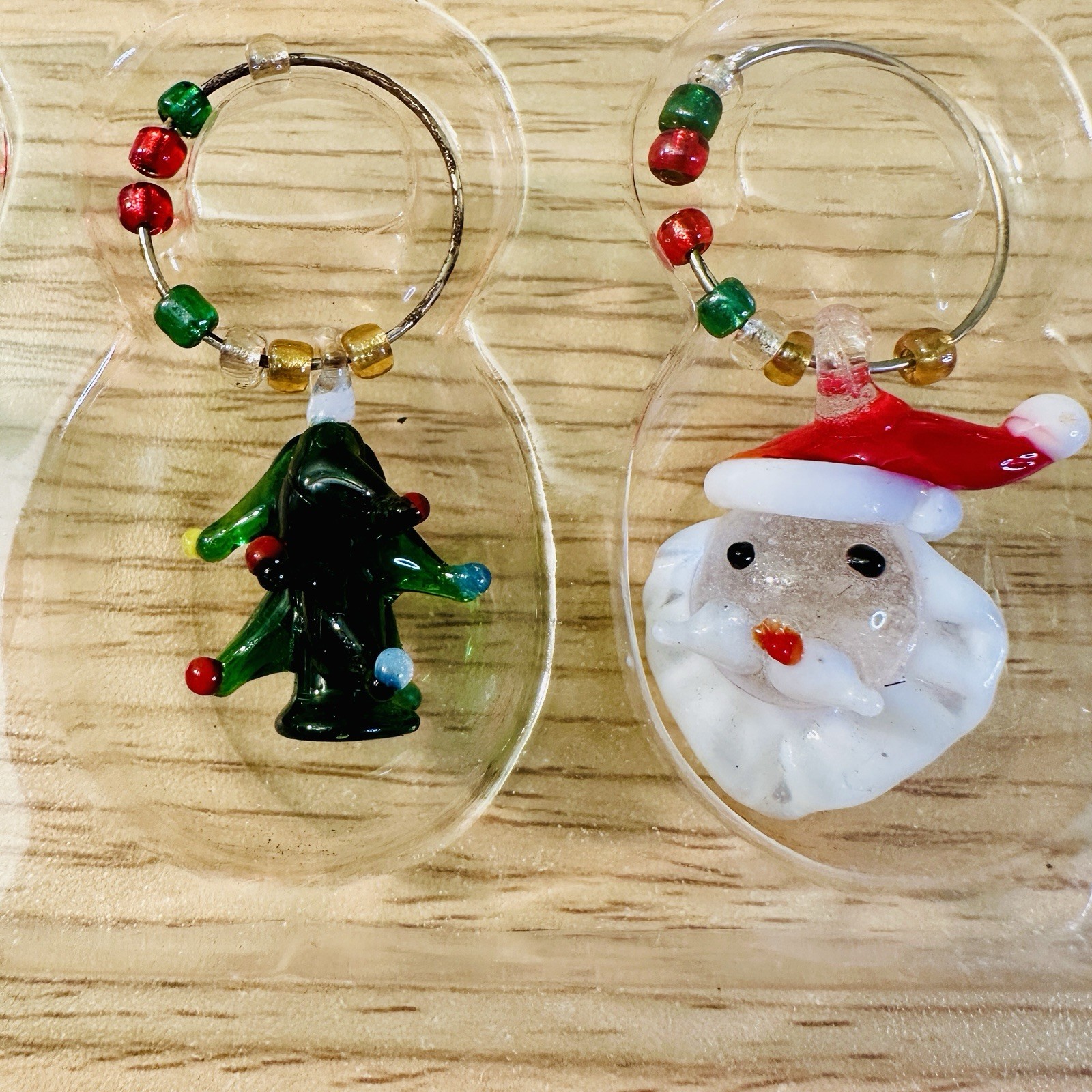 • Set Of 6 Vintage Christmas Holiday Art Glass Wine Charms Markers Santa Tree Etc