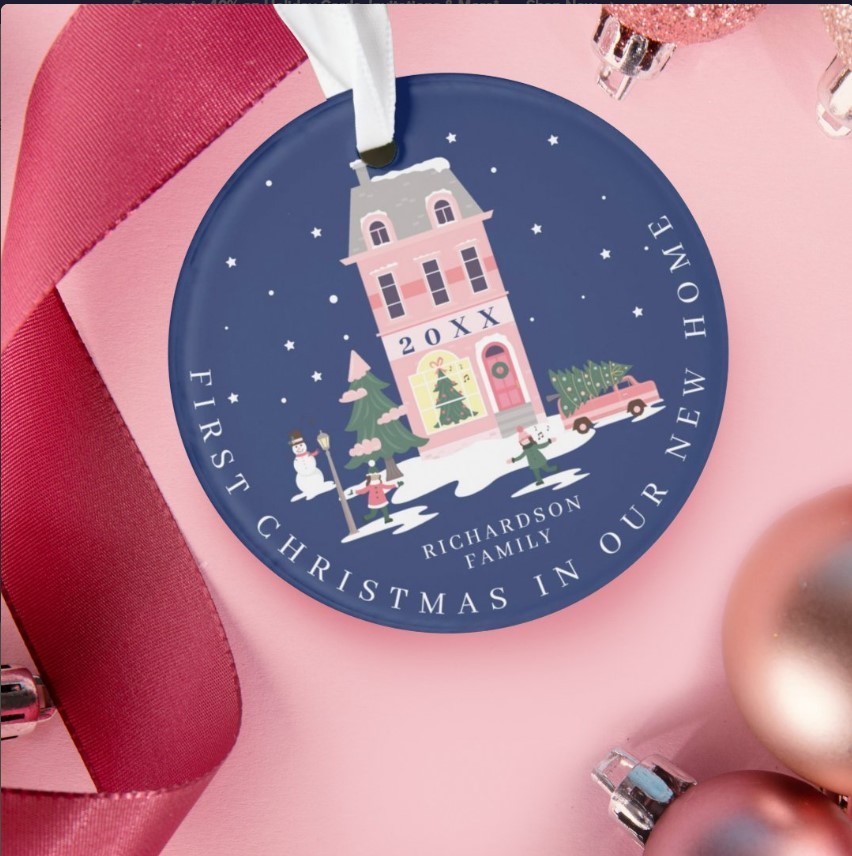 как выглядит Personalized Christmas In New Home Cute Town Pink Retro Van Ceramic Ornament фото