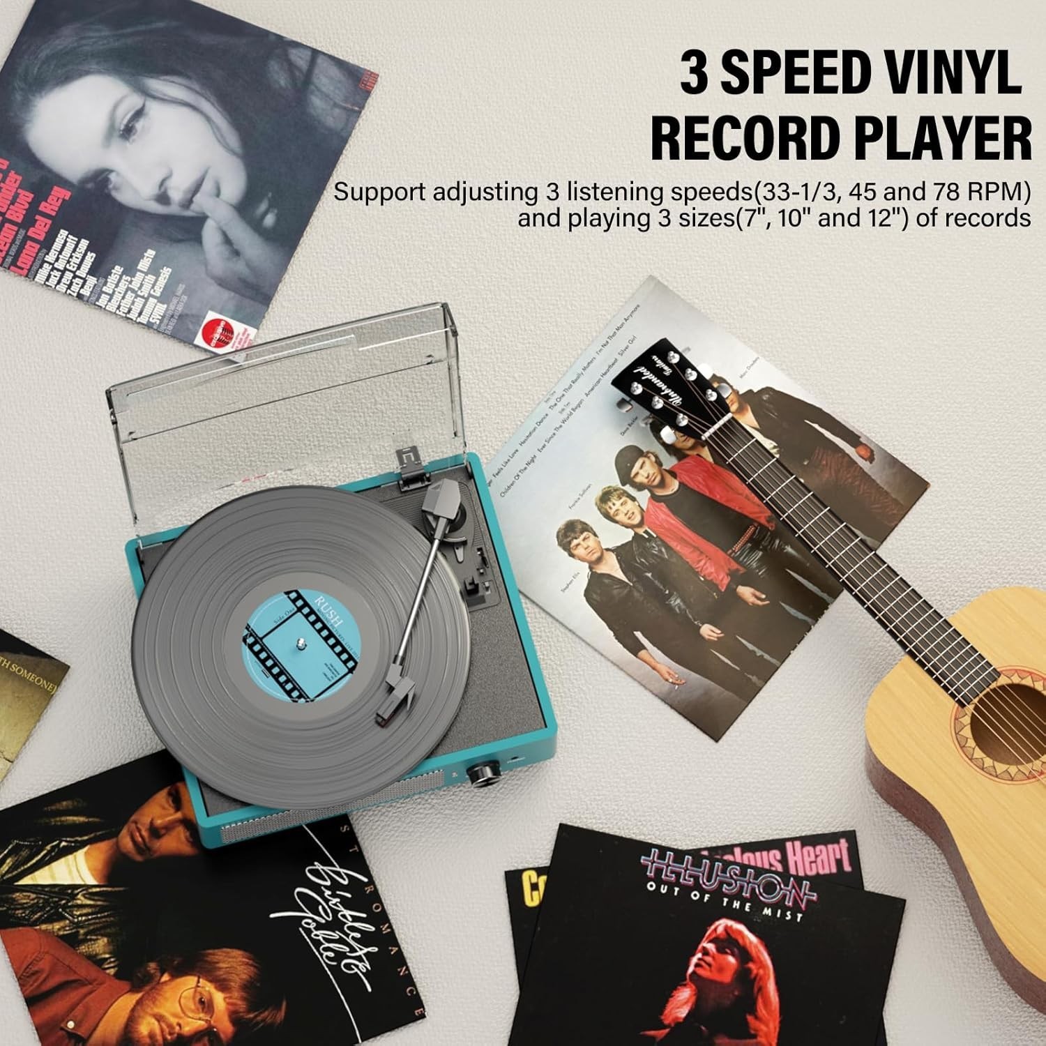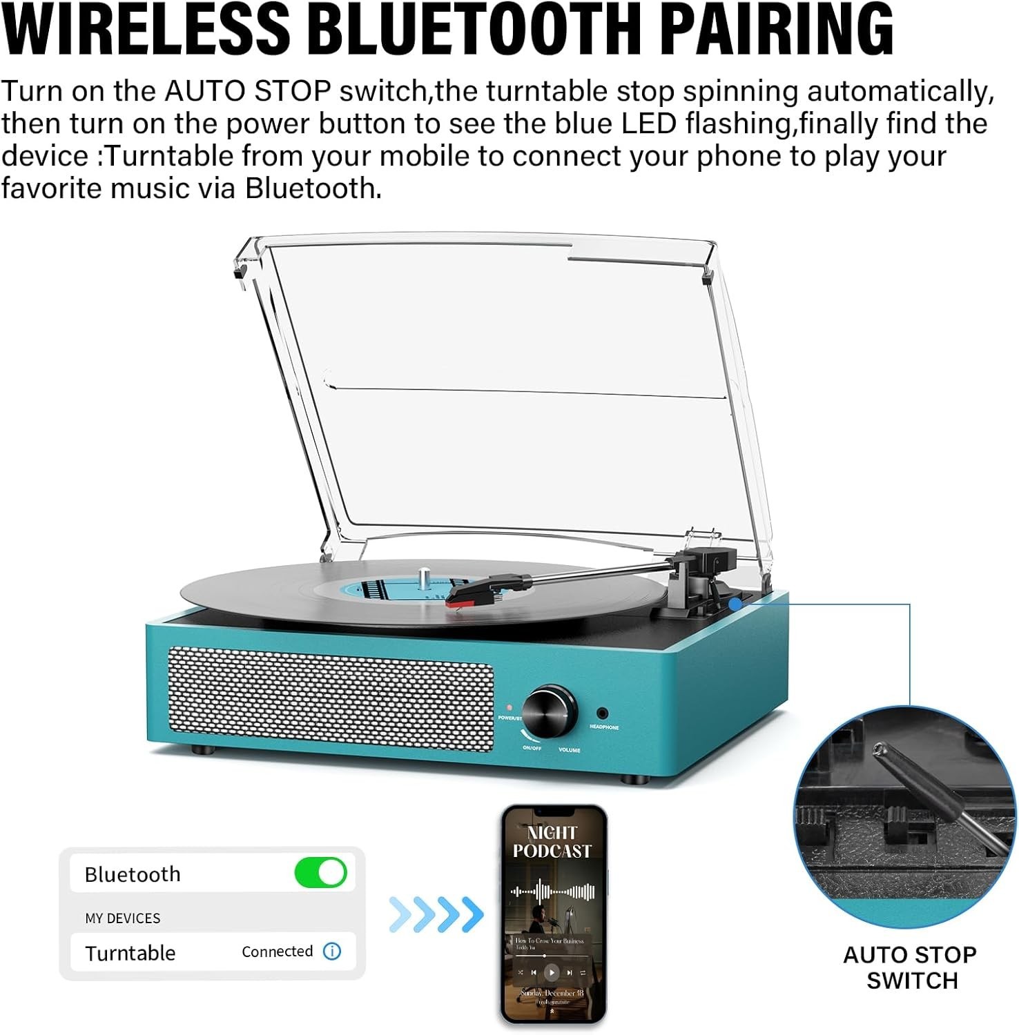Bluetooth Turntable Vinyl Record Player with Speakers, 3 Speed Belt Orange